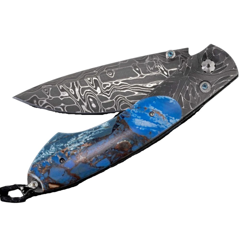 The Spearpoint ‘Blue Fusion’ features a beautiful frame in hand forged ‘X-Out’ damascus by Chad Nichols. The handle is inlaid with a mesmerizingscale of ‘Mammoth Fusion’. The blade is hand-forged ‘Intrepid’ damascus by Chad Nichols; the one-hand button lock and the thumb stud are set with blue topaz gemstones. A remarkable design that gives you an instrument with a full-size secure grip, and a versatile deep-belly blade, the Spearpoint epitomizes William Henry’s core philosophy – that superlative function deserves to be elevated to superlative art. The ‘Blue Fusion’ features some of the most exotic materials, superlative artistry, and hand-forged metals that are the hallmark of William Henry’s collections; a timeless heirloom to be proudly worn and used for a lifetime before being handed-down to another generation.