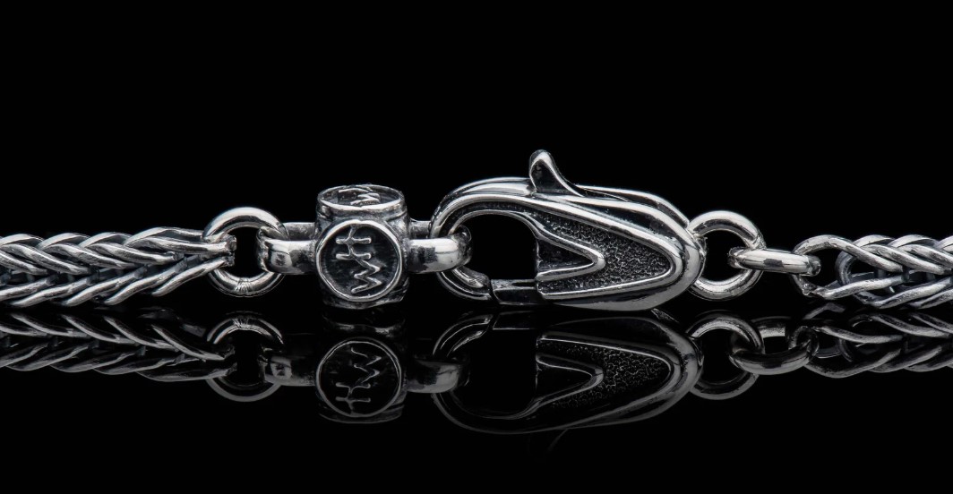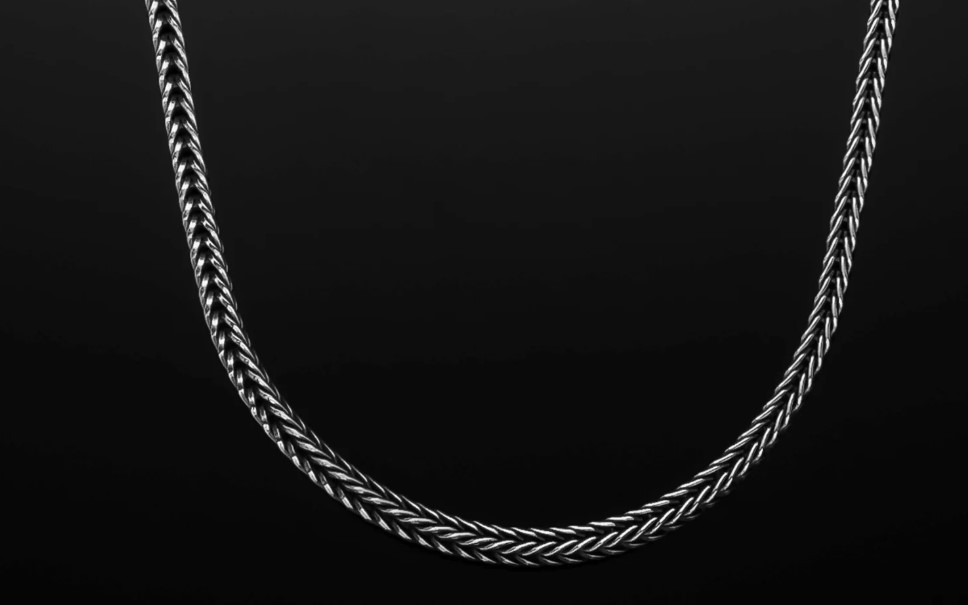Bold, supple, fluid, snakelike, this foxtail chain in sterling silver is in a league of its own. Beautifully oxidized and hand polished, this complex pattern flows around the neck and draws the eye closer. There are a great many foxtail pattern chains outthere, but precious few that rise to the level of art on their own. Finished with our custom lobster clasp Sterling Silver Foxtail Chain 22′