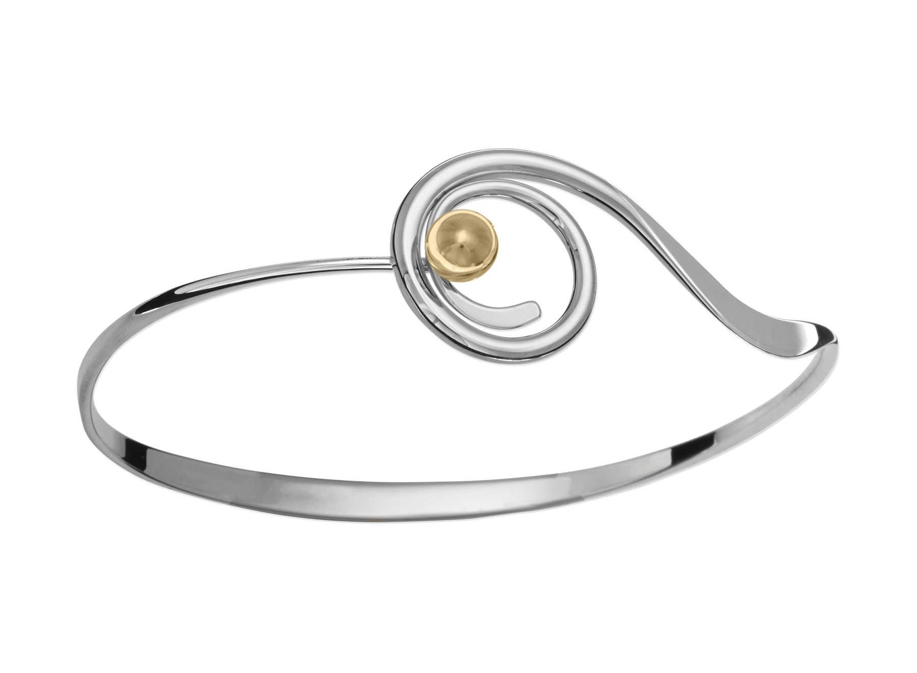 Ed Levin White Sterling Silver Bindu Bracelet with 5mm Gold Ball, Size Small Sizing Info: Approximately 3/8″ at widest point. Description: Reminiscent of a budding flower, the button pearl resting on its stem is feminine and romantic. The swing-openfunction makes it so wearable!
