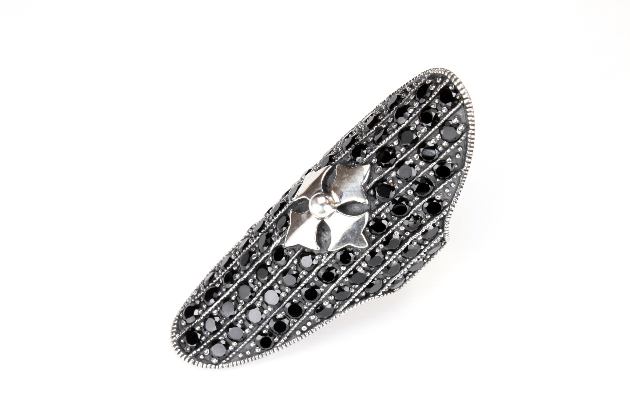 Elongated sterling silver knuckle ring featuring a sprinkled setting of labradorite gemstones and a KIR logo design