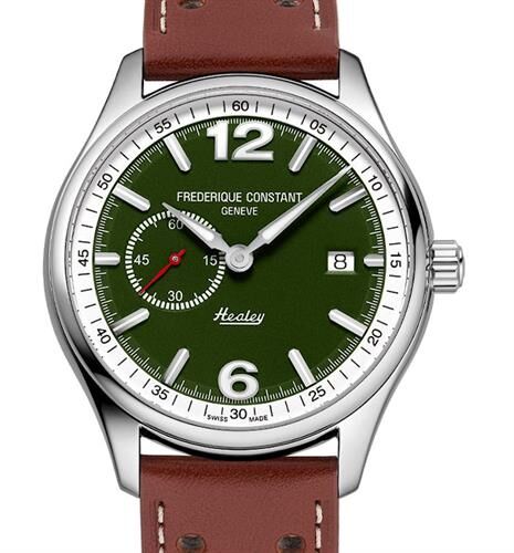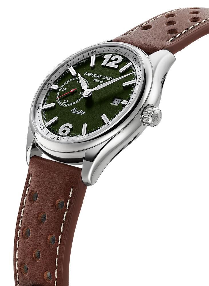 Frederique Constant Vintage Rally Healey Automatic watch. Model FC-345HGRS5B6. Limited Edition of 888 pieces. Swiss automatic movement. Stainless steel case. Green dial with white ring, date, small seconds sub-dial and luminous hands and indexes. Brown leather band. 663/888