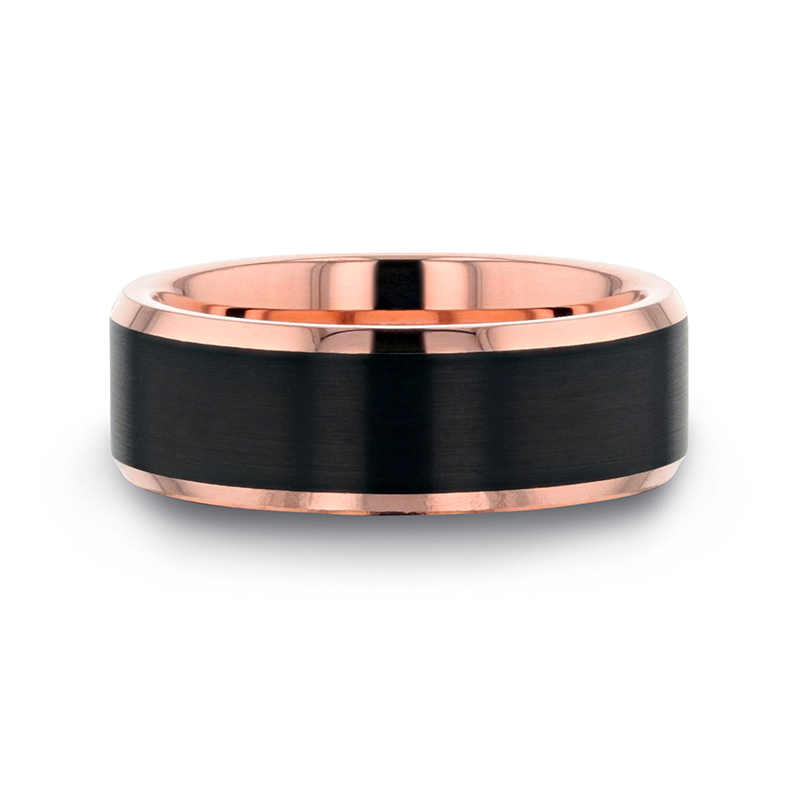 HAYDEN Rose Gold Plated Tungsten Polished Flat Beveled Ring with Brushed Black Center – 6mm