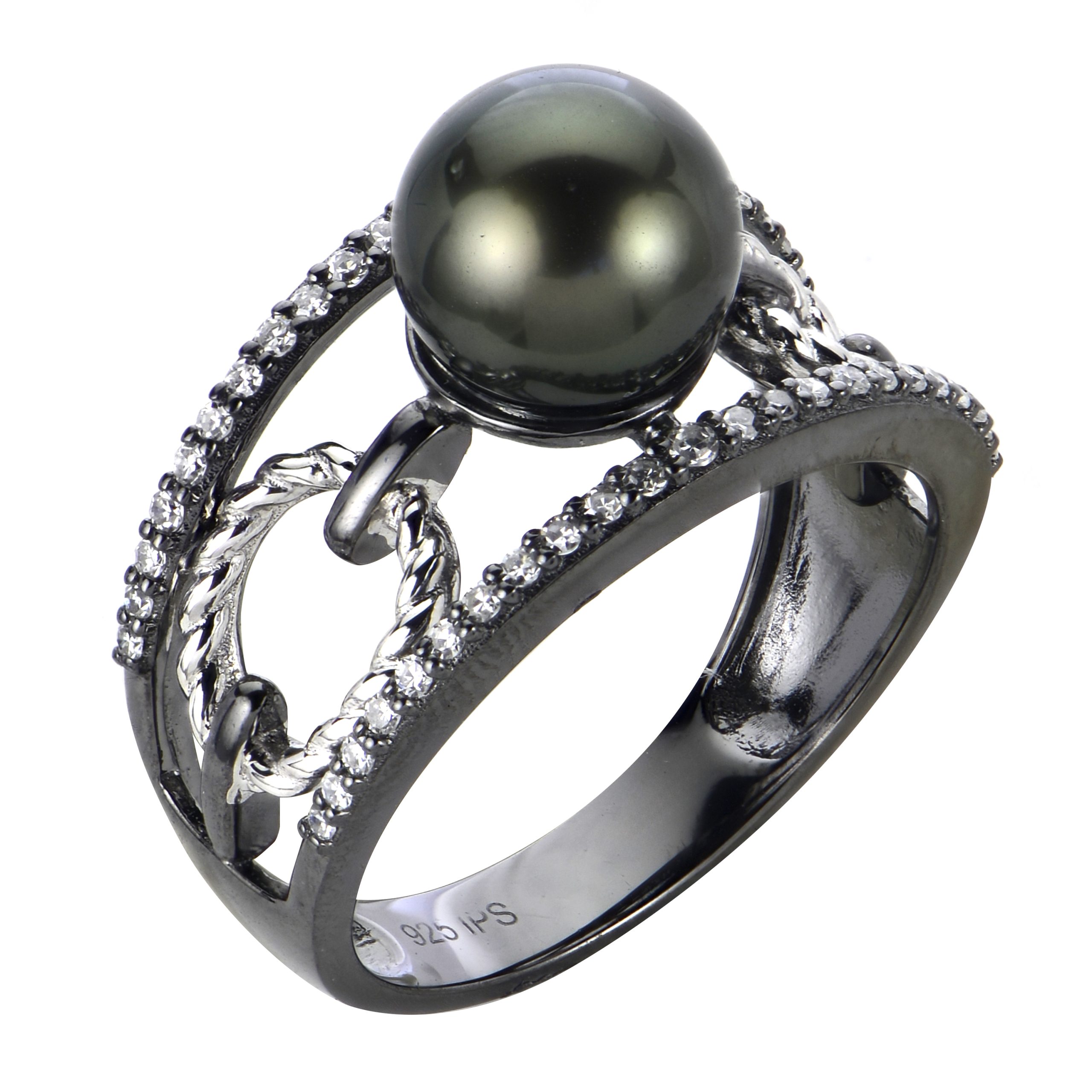 925 BLK/WHT RHODIUM 2-TONE 8-9MM TAHITIAN CP & DIA RING