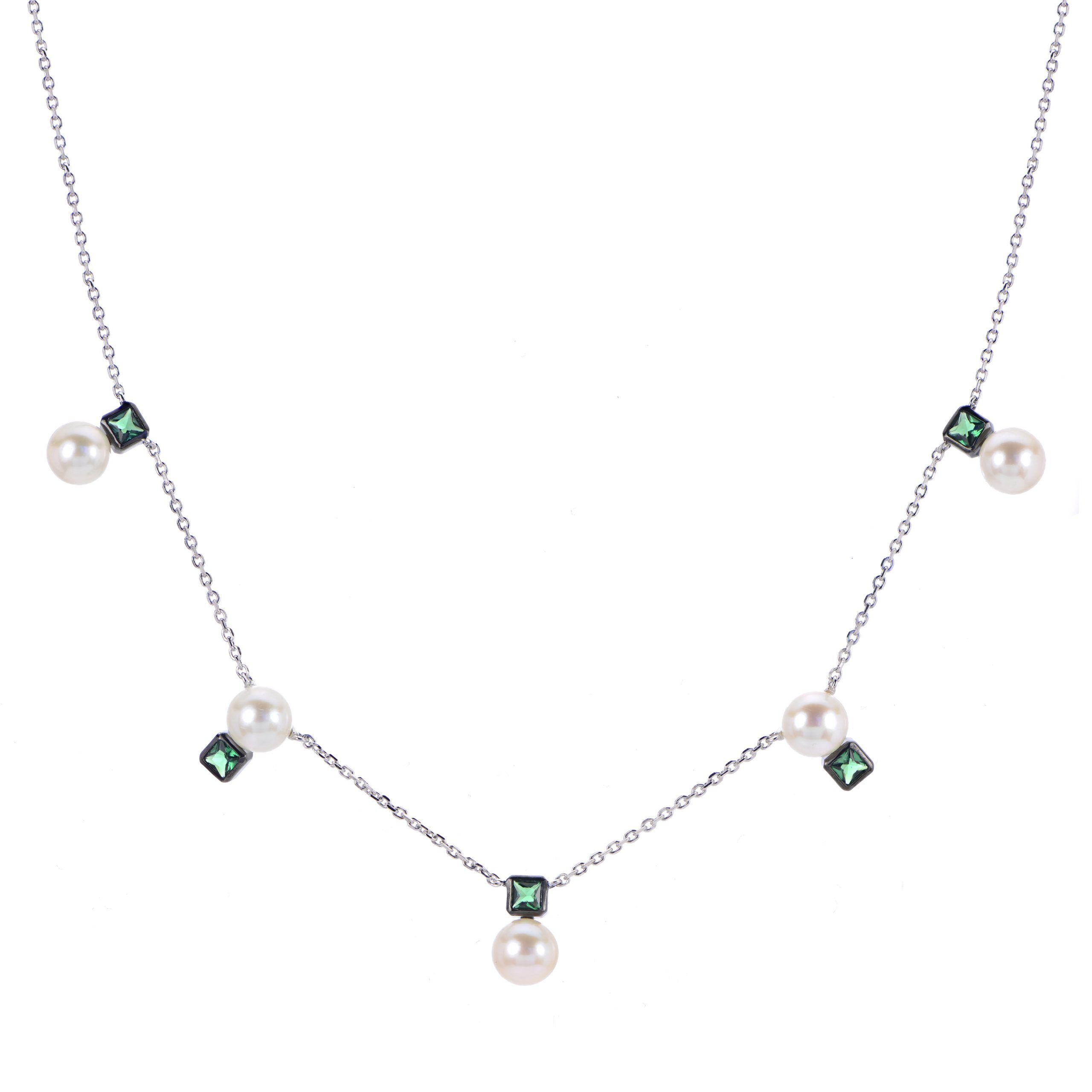 18″ 925 BLK/RH 6.5-7MM AA FWCP & LAB CREATED EMERALD NECKLACE