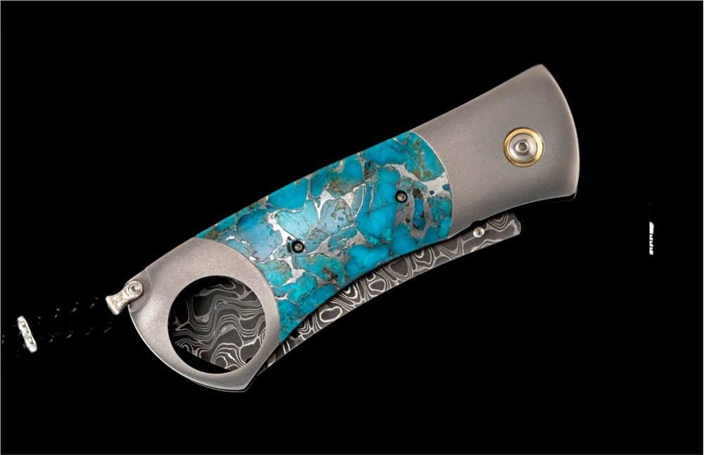 The Kingman is aptly named, without equal in the world of exotic cigar cutters. The thru hole in the titanium frame will accommodate up to a 52 gauge cigar, and the single sided precision ground Damascus blade cuts cleanly thru your preferred smoke. The Damascus is our stainless ‘Intrepid’ pattern by Chad Nichols, featuring three alloys forged together into a tapestry in steel with an optimum hardness of HRC 59 for wear resistance. Inlayed Zinc-Matrix Kingman Turquoise is hand-polished to fine luster, and Kashmir Blue Topaz gemstones, copper, stainless, and sterling hardware complete the presentation. This piece works beautifully as a cigar cutter and general purpose pocket knife!
