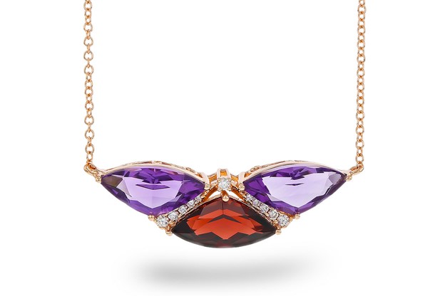 Lady’s Rose 14 Karat 3 Stone Necklace With 2= Marquise Amethysts, One Marquise Garnet And 0.09 Twt Other Stones Chain: Cable Link