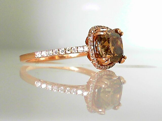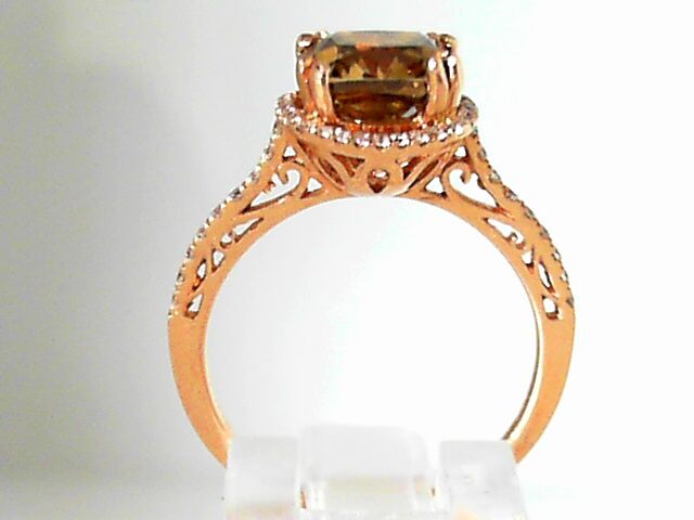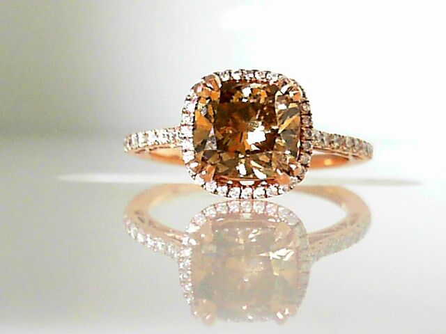 Lady’s Rose Polished 14 Karat Cushion Halo Engagement Ring Size 6 With One 2.12Ct Cushion Si2 Cognac Diamond And 50=0.24Tw Round G/H Si2 Diamonds Gram Wt: 2.71