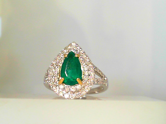 Lady’s Two Tone 18 Karat Double Halo Split Shank Fashion Ring Size 6.5 one 01.34ct Pear GreenNatual Columbian Emerald