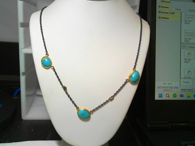 Lady’s Two Tone 24K & Oxy .925 3 Stone Necklace Length 18 With 3=7.75Tw Various Shapes Turquoises And 0.06Tw Round Diamonds Chain: Cable Link Metal: 24K & oxy .925 Color: Two Tone Length: 18 Clasp: lobster