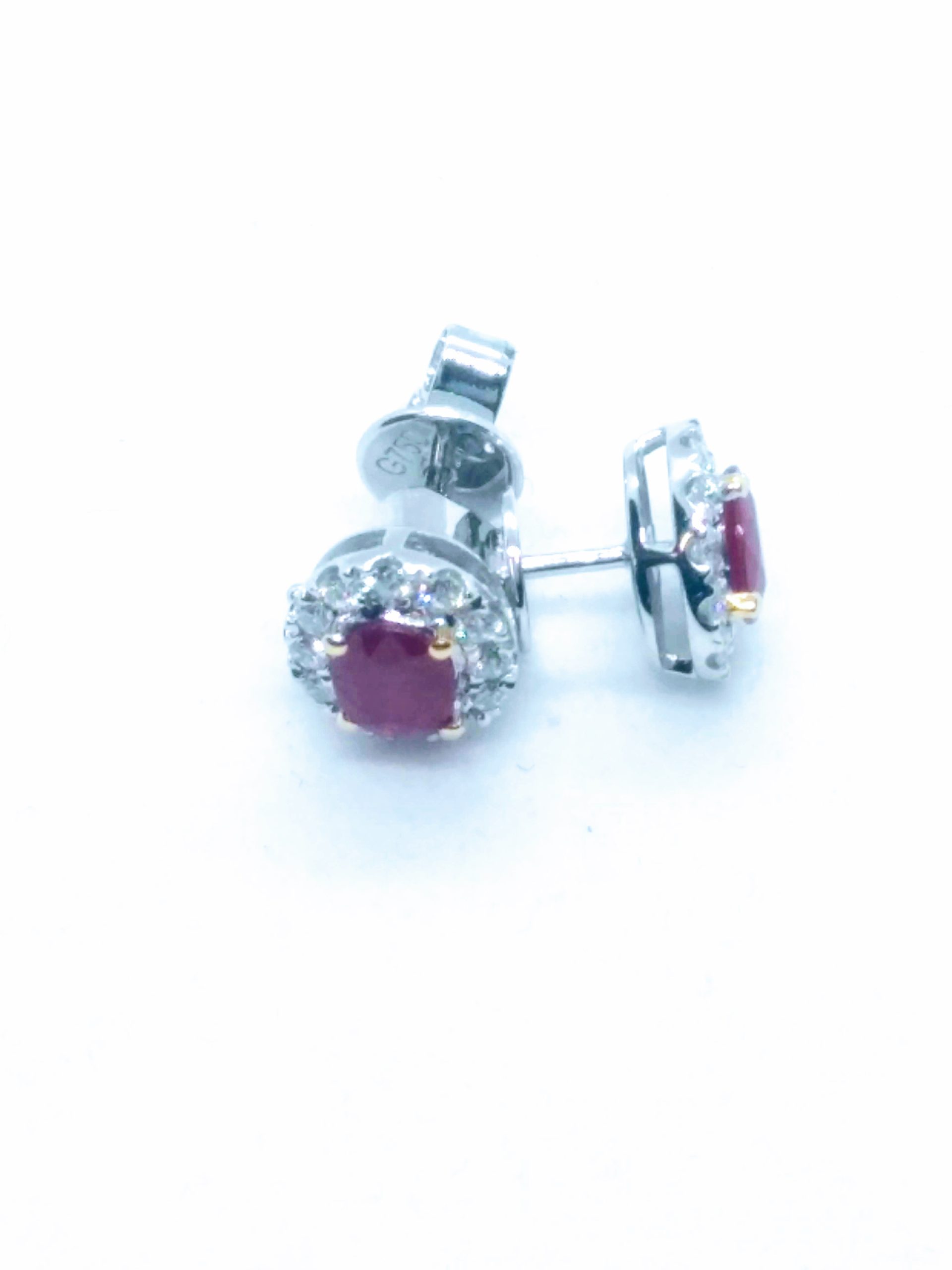 Lady’s Two Tone White/Yellow 18 Karat Halo Stud Earrings With 2=0.67Tw Oval Red Rubys And 24=0.26Tw Round G/H Vs2 Diamonds