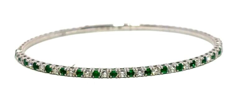 Lady’s White 14 Karat Flex Bangle Bracelet 17 = 0.87tw Round G/H VS2 Diamonds 17 = 0.82tw Round Green Emeralds