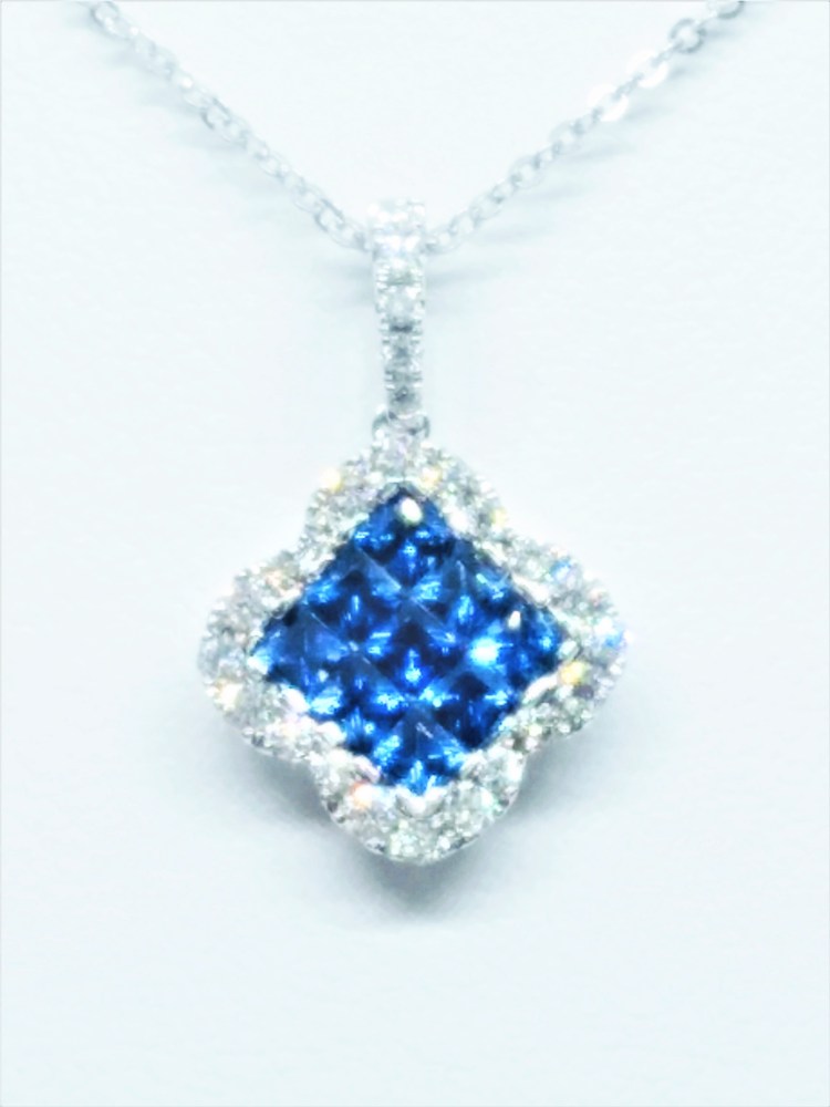 Lady’s White 18 Karat Blue Sapphire And Diamond Flower Necklace With 9=1.28Tw Invisible set Princess Blue Strong Sapphire And 25=0.38Tw Round G Vs2 Diamonds