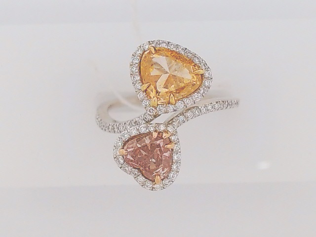 Lady’s White 18 Karat Contemporary Fashion Ring Size 7 With One 0.90Ct Heart Si2 Diamond And One 0.92Ct Heart Pink Diamond