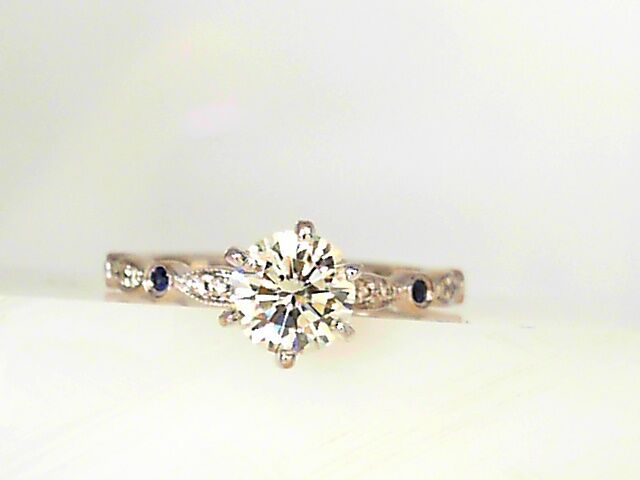 Lady’s White 18 Karat Polished/Milgrain Vintage Inspiered Natural Diamond/Nat Blue Sapphire Engagement Ring with 6 prong Center Size 6