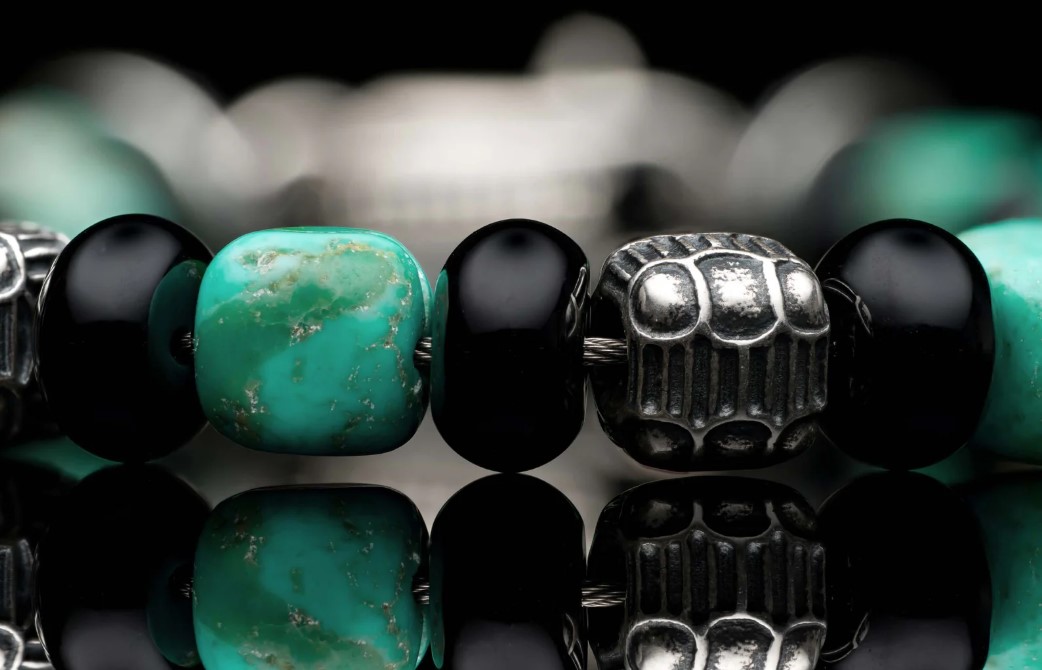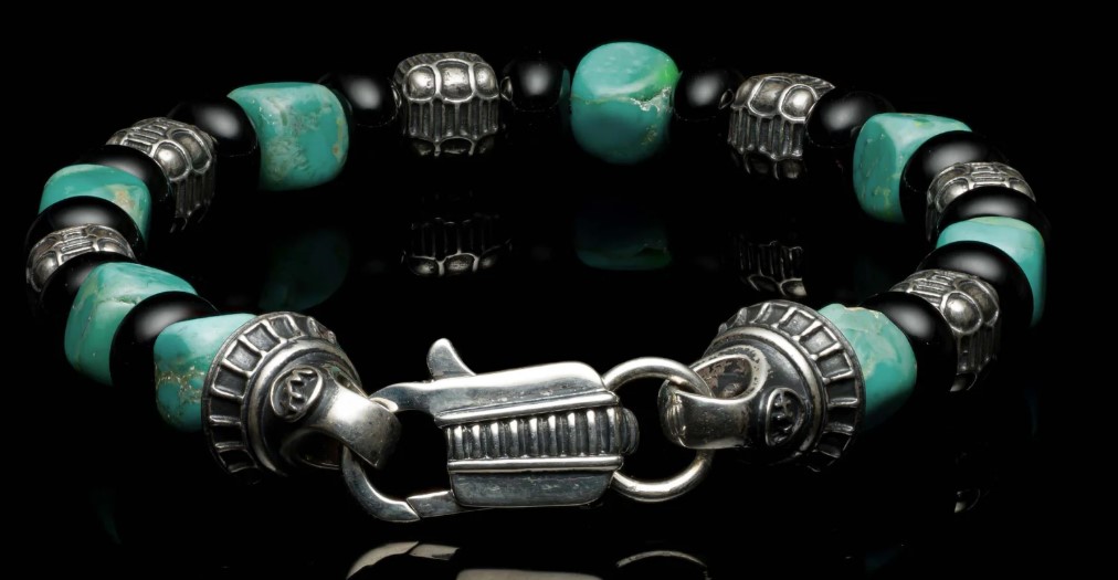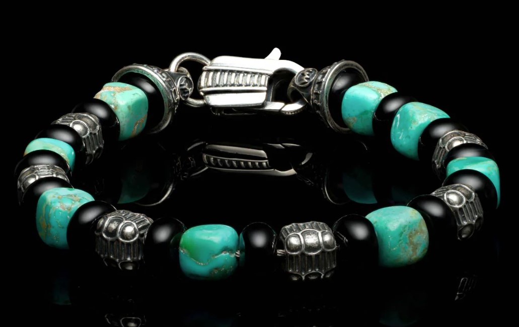 Featuring Kingman turquoise cube beads, polished black onyx rondelles, and sculpted sterling silver quilted cube beads—finished with a custom clasp.