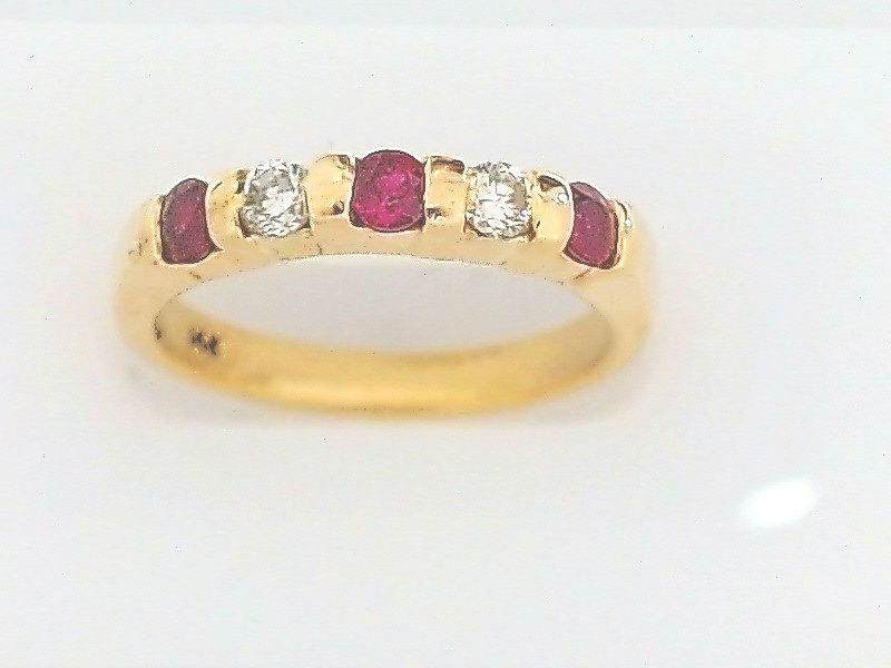 Lady’s Yellow 14 Karat Band Fashion Ring Size 7 With 3 = Round Rubys And 2 = Round Diamonds