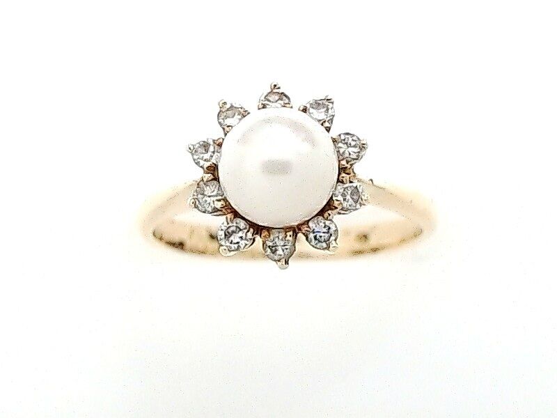 Lady’s Yellow 14 Karat Flower Fashion Ring Size 6 With 10 = Round Diamonds And One = Round Pearl