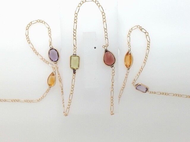 Lady’s Yellow 14 Karat Gemstone Necklace With 3 = Various Shapes Citrines, 2 = Various Shapes Amethysts And Other Stones
