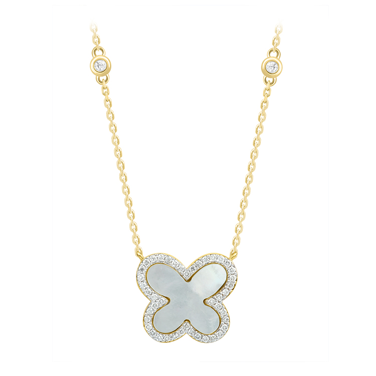 Lady’s Yellow 14 Karat Mother Of Pearl/Natural Diamond Butterfly With Bezel Diamond Stations Necklace Length 18 0.lobster Clasp .41tw Round G/H SI1 Diamonds