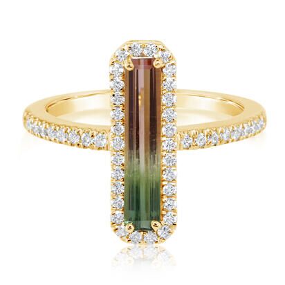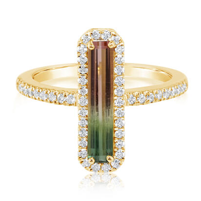 Lady’s Yellow 14 Karat Wtrmln Tour & Dia Fashion Ring Size 7 48 = 0.336tw Round H SI2 Diamonds one = 1.08ct Emerald Watermelon Tourmaline Freeform Parti Color Tourmaline from Brazil (Weight Varies) – H2OC250 – Enhancement: None (Natural) Total Gem Weight: 1.08 tcw Diamonds: Stone Count: 48 Total weight: 0.336 ct Grade: H-I SI2