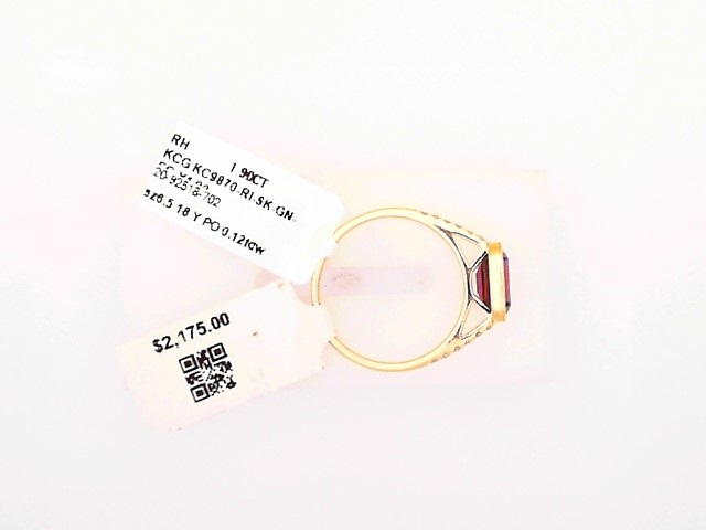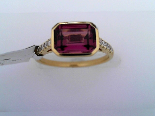 Lady’s Yellow 18 Karat Bezel Set East To West Cathederal profile Fashion Ring Size 6.5 one = 1.90ct Emerald Purple Rhodolite Garnet