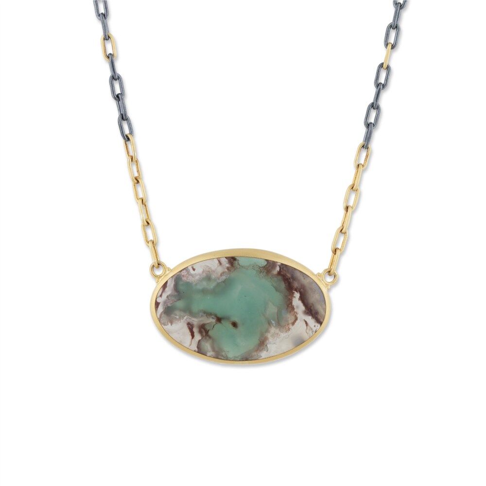 22KL Gld “My World” One of a Kind Oval Aquaprase – 22x41mm approx 51.39ct – attached with Two Tone 22k & .925 oxy 16, 17, 18 cable clip chain
