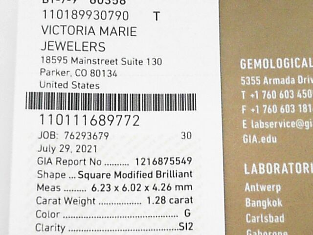 Loose Stones one 1.28ct Princess G SI2 Diamond