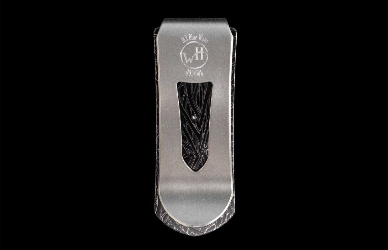 The Zurich ‘Blue Wave’ is a beautiful money clip featuring a frame in hand-forged ‘Brain Wave’ damascus by Chad Nichols, inlaid with blue 10,000 year-old fossil Woolly Mammoth tooth, and white topaz gemstone.