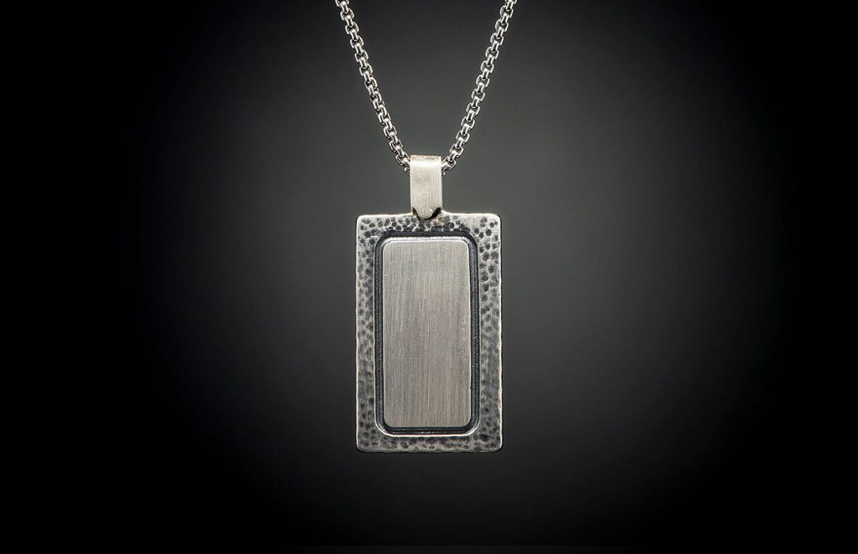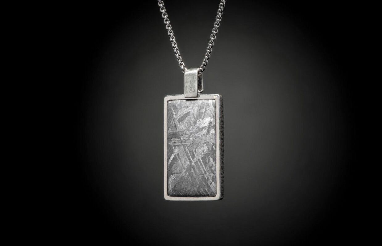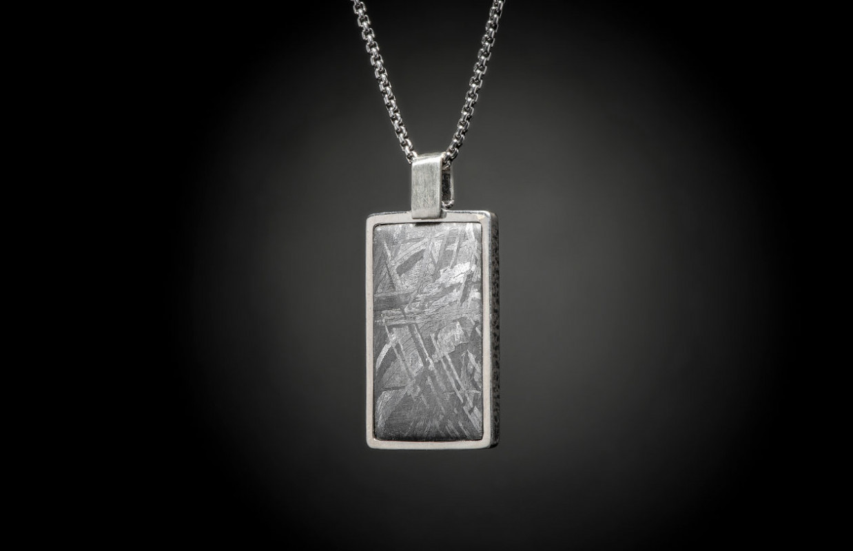 The Meteorite Shift pendant embraces the stars – featuring inlaid Meteorite, one of the rarest materials on Earth. Billions of years old, surviving a cosmic journey to crash intact onto the planet, now part of your personal legacy. It is set into an elegant Sterling Silver pendant presented on an antique finish sterling silver chain. Engraving space on the back to make a timeless statement.
