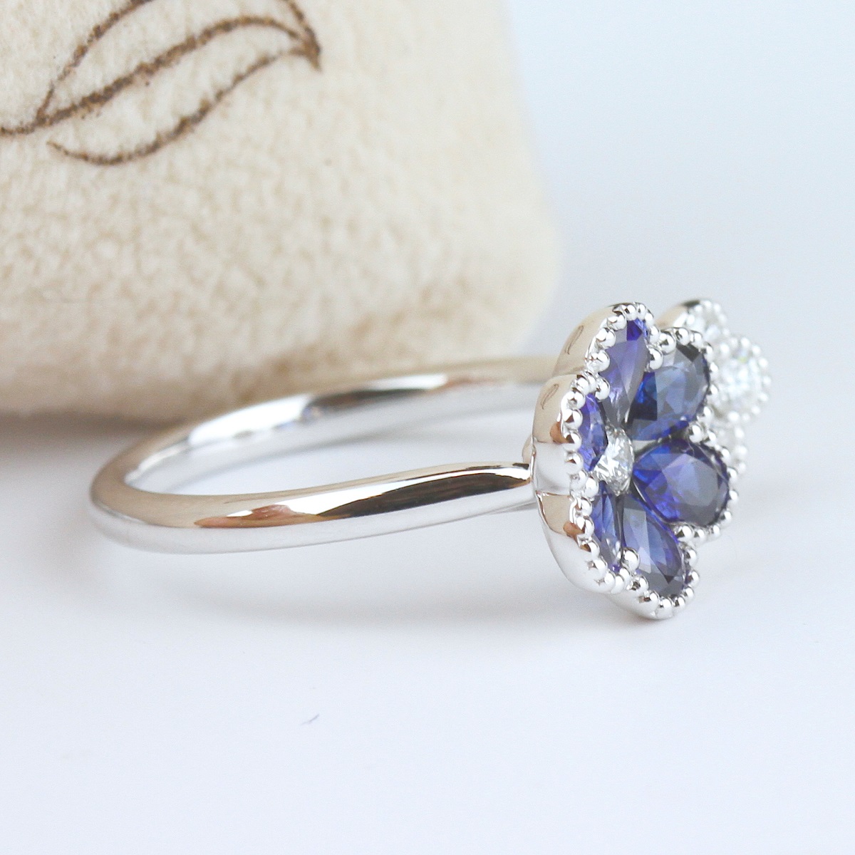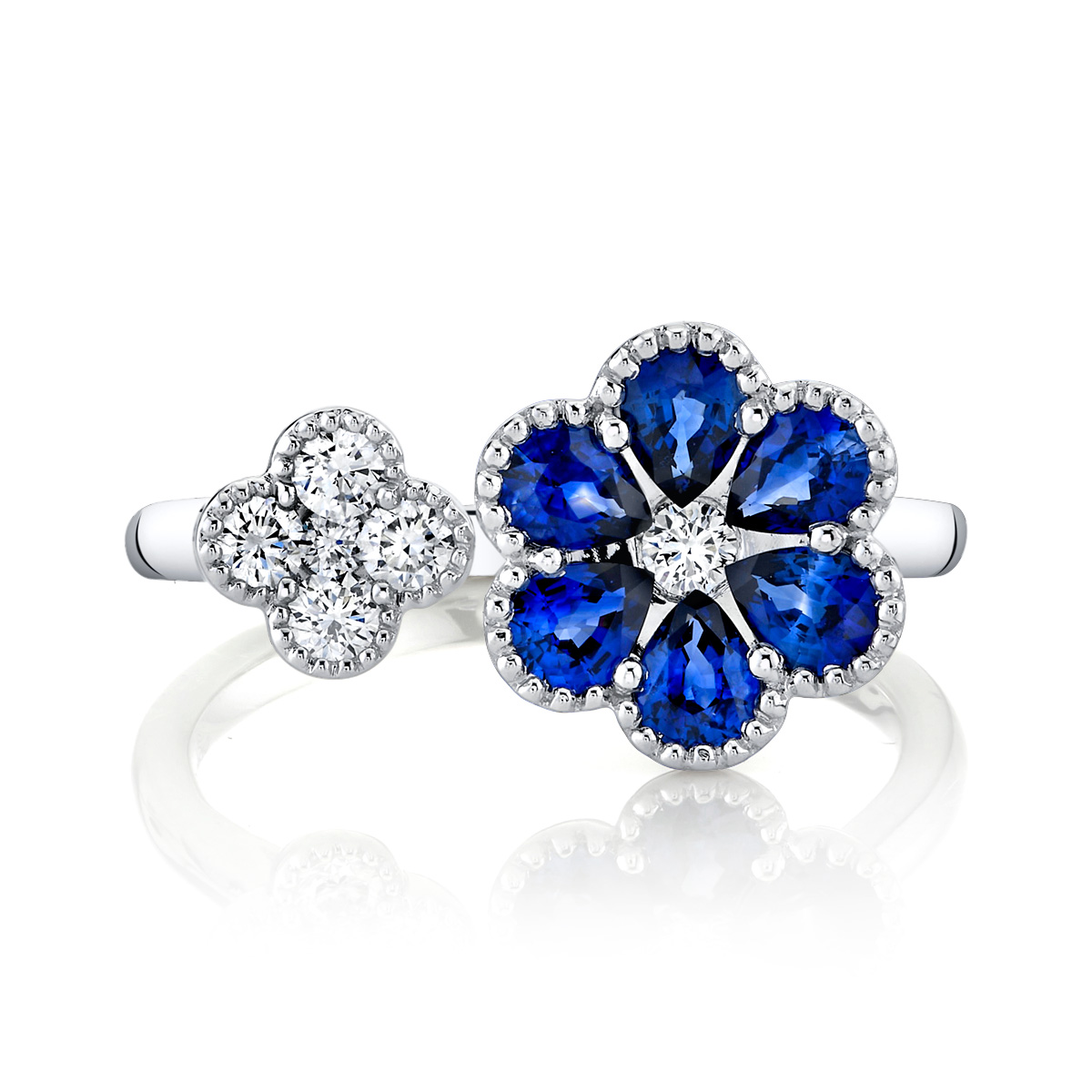 Gorgeous Floral Sapphire and Diamond Ring Available in Platinum, as well as 18K White, Yellow or Rose Gold.