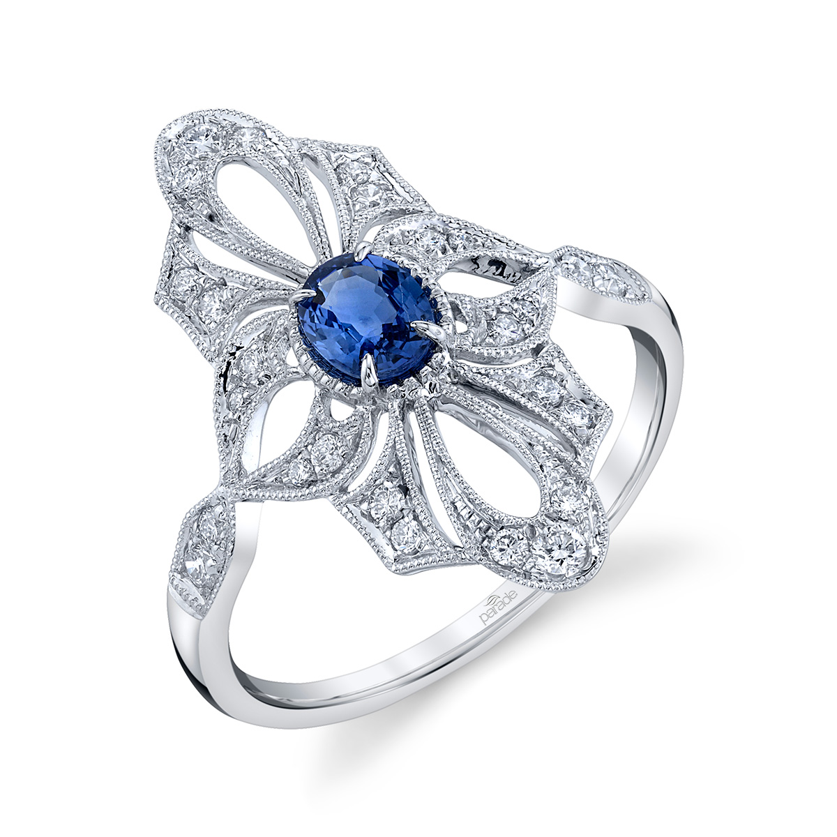 A vintage art deco inspired ring with a bright blue sapphire center from the Parade in Color Collection Available in Platinum, as well as 18K White, Yellow or Rose Gold.