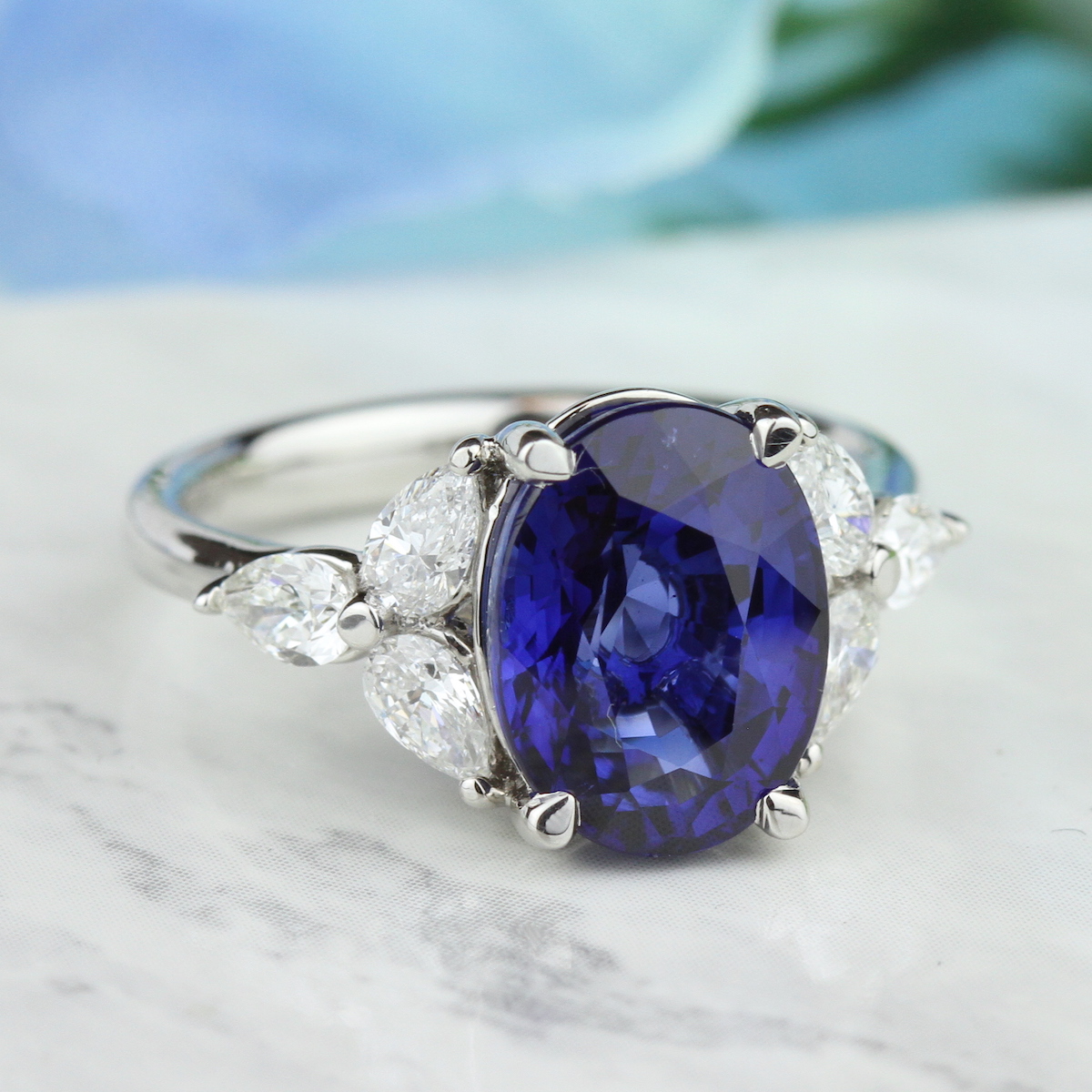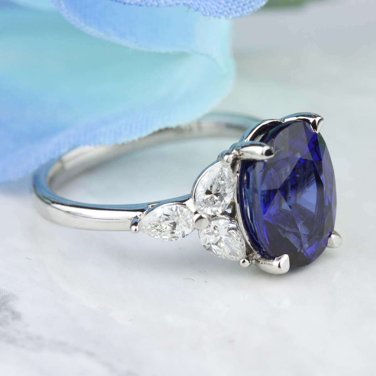 A dreamy blue sapphire is naturally lifted by pearshape diamond trefoils. Available in Platinum, as well as 18K White, Yellow or Rose Gold.