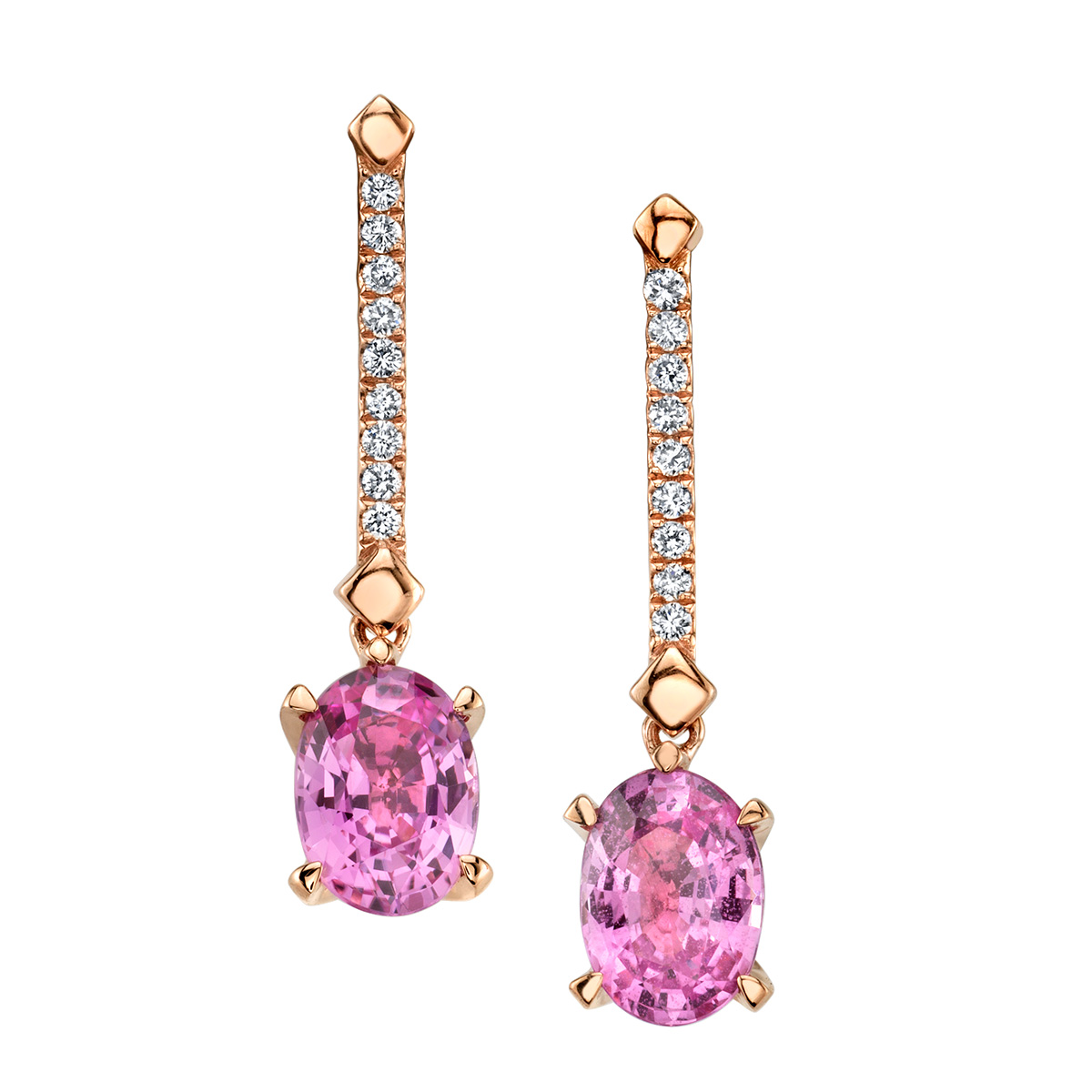 From the Parade in Color collection, drops of bright pink sapphires dangle from diamond set posts of gleaming 18K rose gold. Available in Platinum, as well as 18K White, Yellow or Rose Gold.