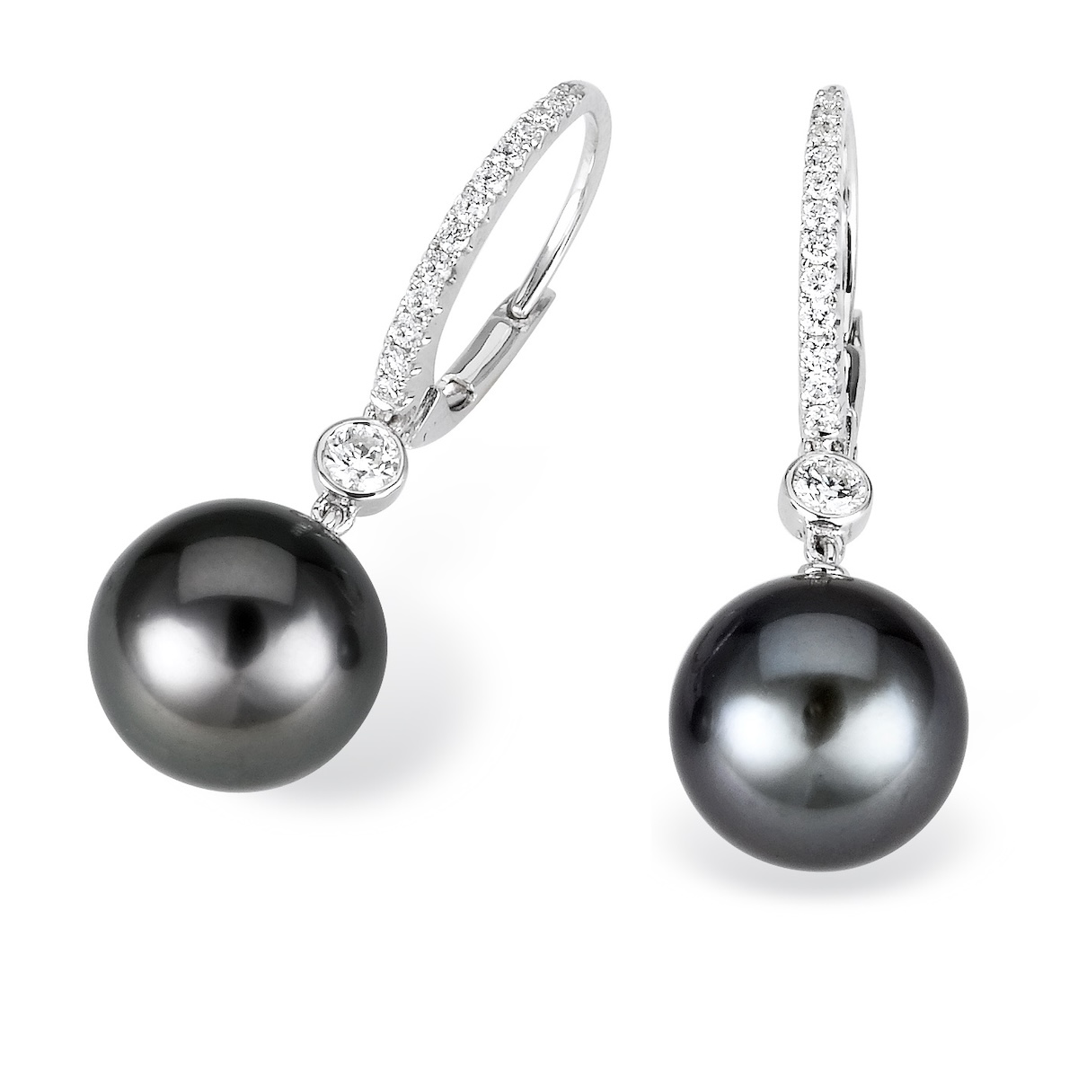 Two lustrous peacock pearls are the highlight of these lovely dangle hoop earrings Available in Platinum, as well as 18K White, Yellow or Rose Gold.