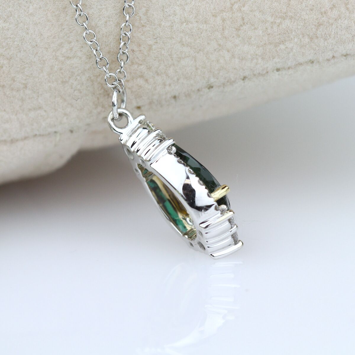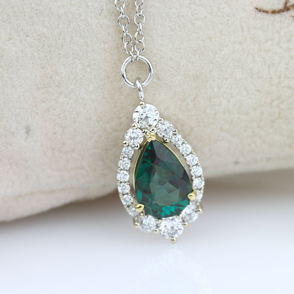A majestic green tourmaline rests above a halo of graduating diamonds and floats from a lustrous gold necklace. Available in Platinum, as well as 18K White, Yellow or Rose Gold.