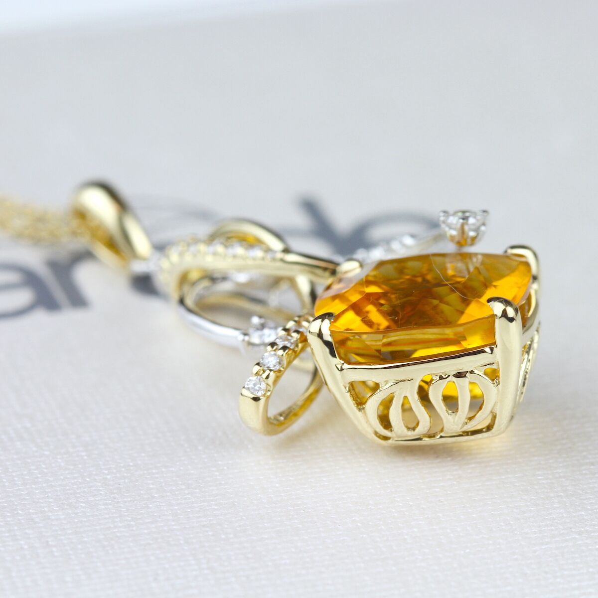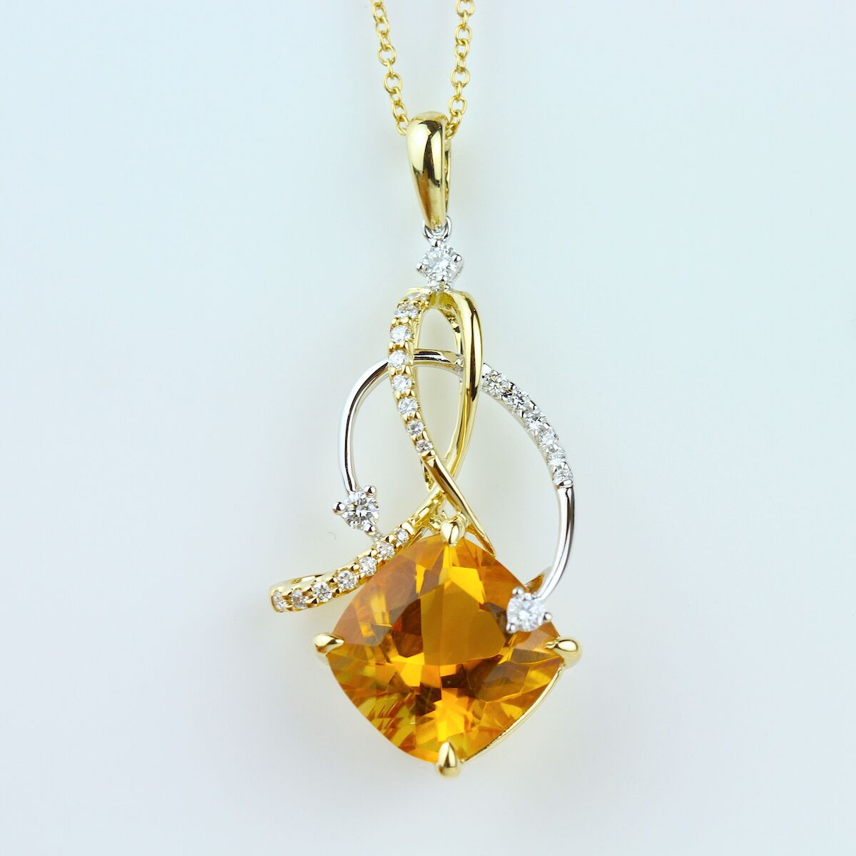 A cushion-cut citrine shines beneath curls of diamonds and gleaming 18K gold. Available in Platinum, as well as 18K White, Yellow or Rose Gold.