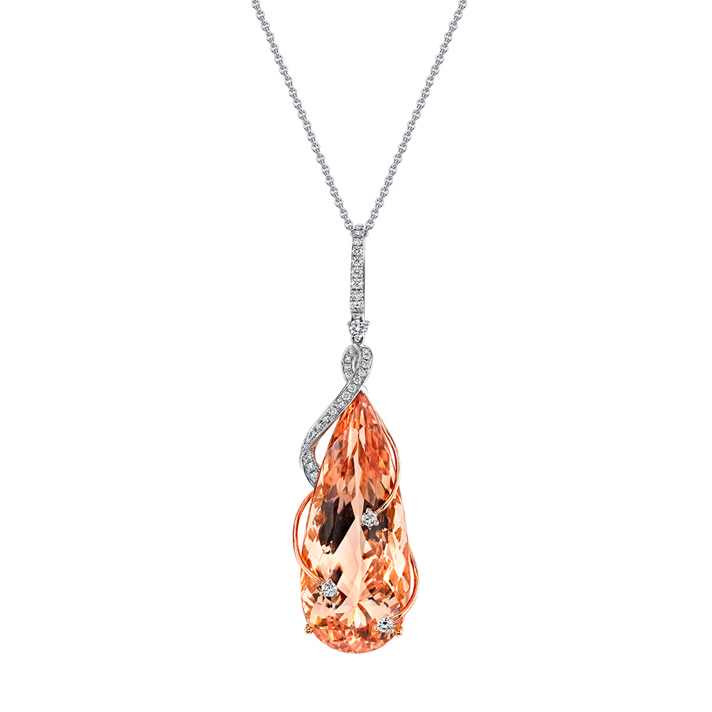 A stunning 46.32 carats of glowing Morganite is suspended from ribbons of sparkling white diamonds set in gleaming 18K white and rose gold. Available in Platinum, as well as 18K White, Yellow or Rose Gold.
