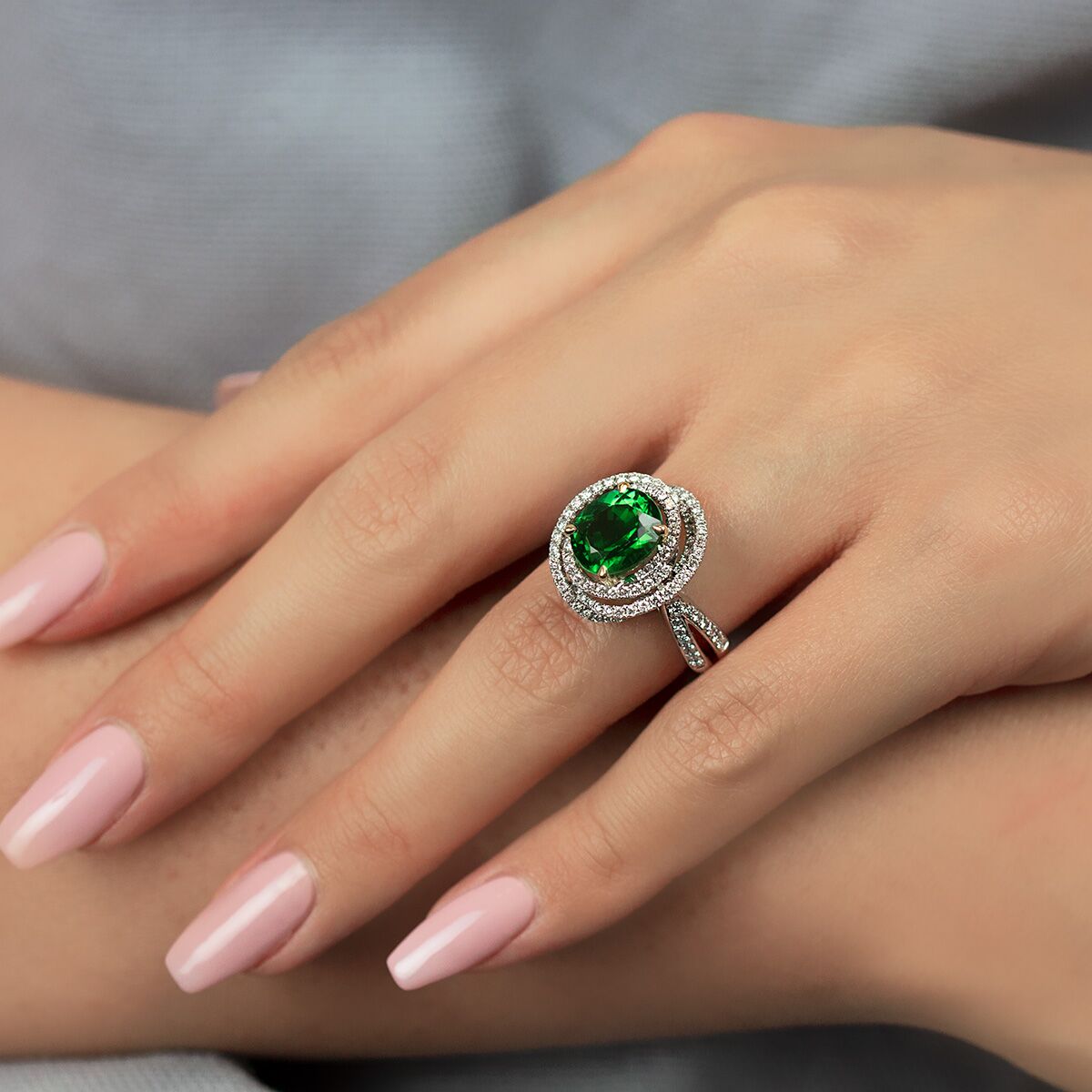 Multiple halos of sparkling white diamonds orbit a 3.19 carat vibrant green tourmaline. Available in Platinum, as well as 18K White, Yellow or Rose Gold.