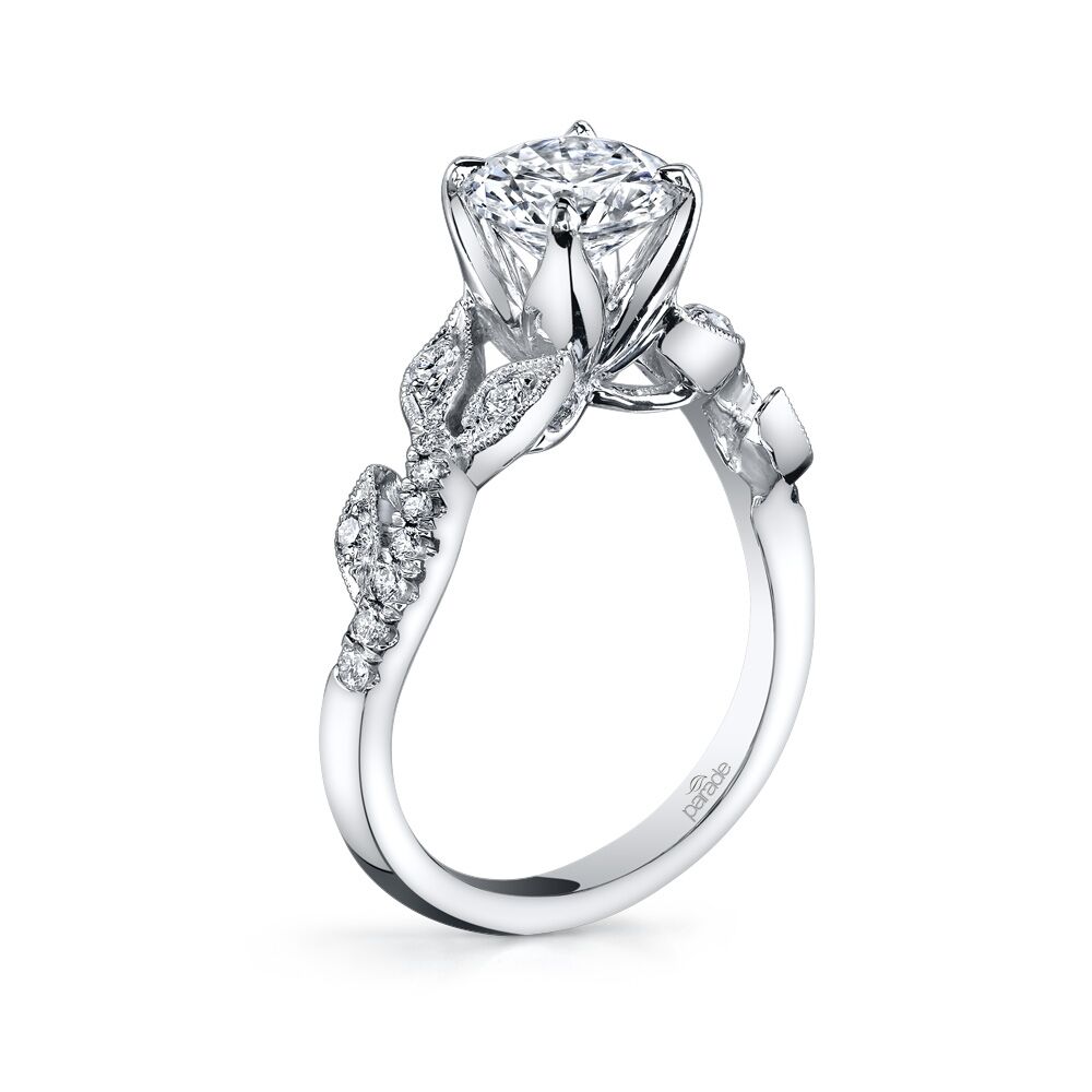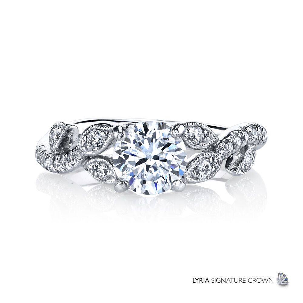 Milgrain-etched diamond accented leaves climb toward a brilliant center stone set in the signature Lyria crown. Available in Platinum, as well as 18K White, Yellow or Rose Gold.