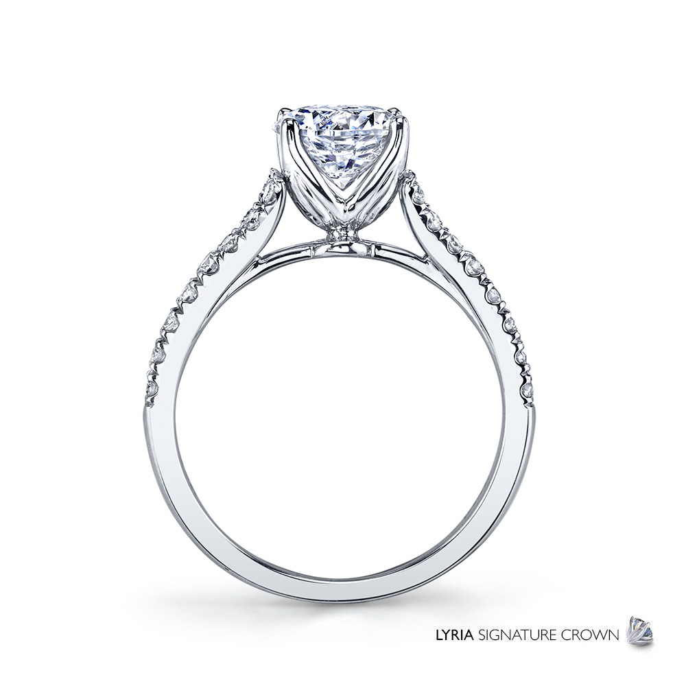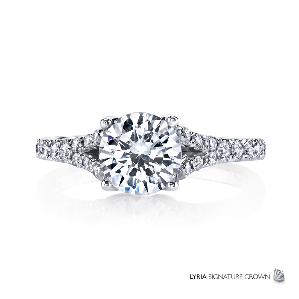 A split diamond shank leads to a brilliant round center set in the Lyria signature crown in this timeless classic. Available in Platinum, as well as 18K White, Yellow or Rose Gold.