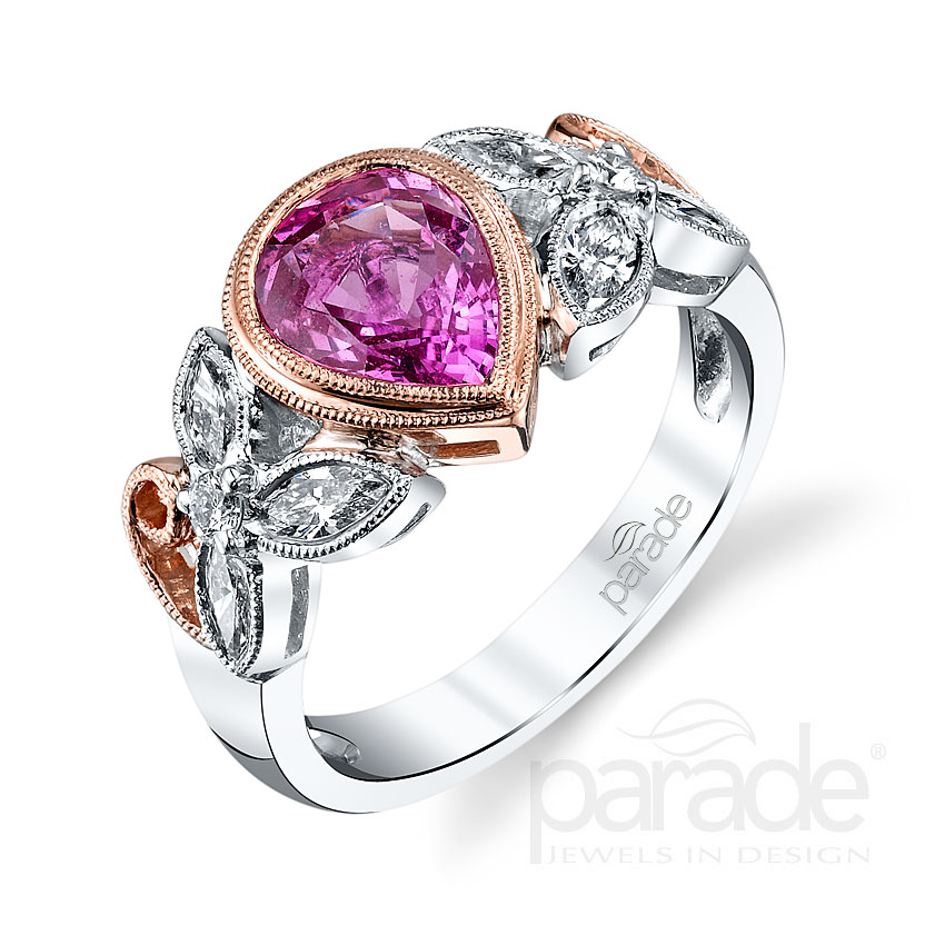 Blossoming diamond accented flowers frame a vivacious 1.51 carat tear-drop pink sapphire set in 18K rose gold. Available in Platinum, as well as 18K White, Yellow or Rose Gold.