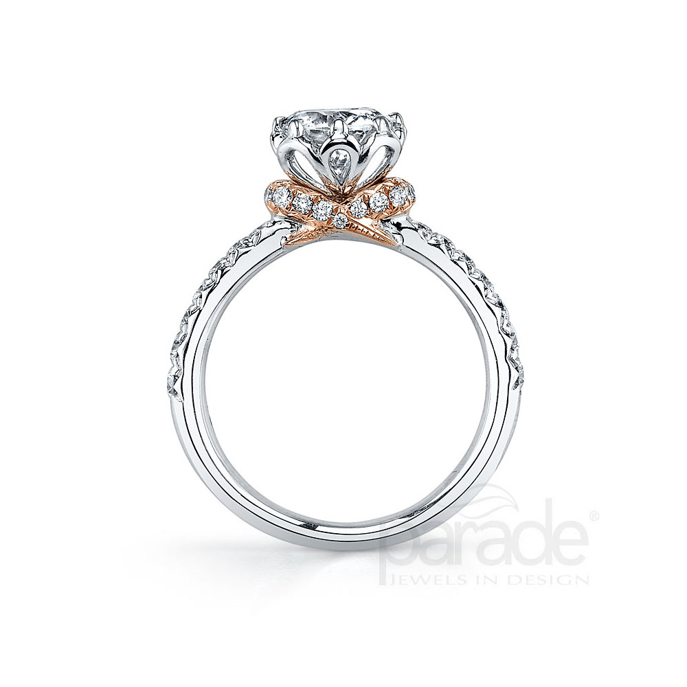 A delightful rose gold bow elevates a brilliant round diamond. Available in Platinum, as well as 18K White, Yellow or Rose Gold.
