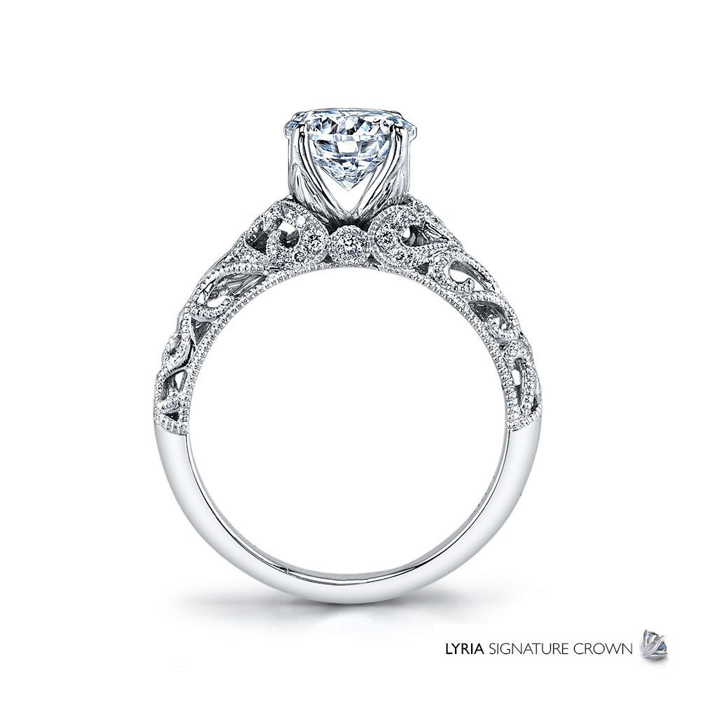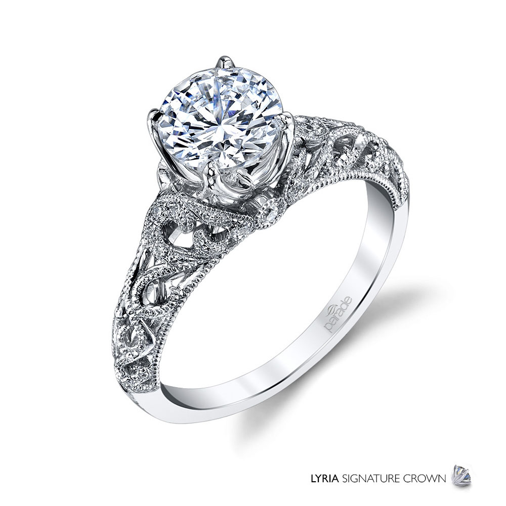Intricate diamond set curls with fine milgrain detailing showcase a sparkling center stone, set in Parade’s Lyria Signature Crown. Available in Platinum, as well as 18K White, Yellow or Rose Gold.