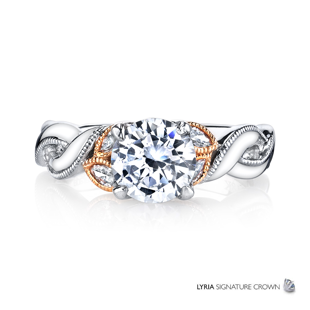 Fancy marquise diamonds set in a touch of rose gold and gleaming high-polish curves showcase a brilliant center stone. Available in Platinum, as well as 18K White, Yellow or Rose Gold.