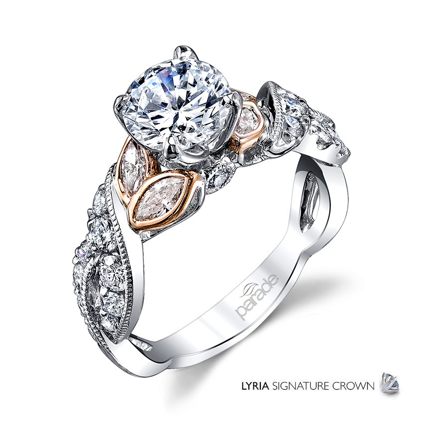 Fancy marquise diamonds wrapped is Rose Gold and sparkling twists of white diamonds showcase a brilliant center stone. Available in Platinum, as well as 18K White, Yellow or Rose Gold.