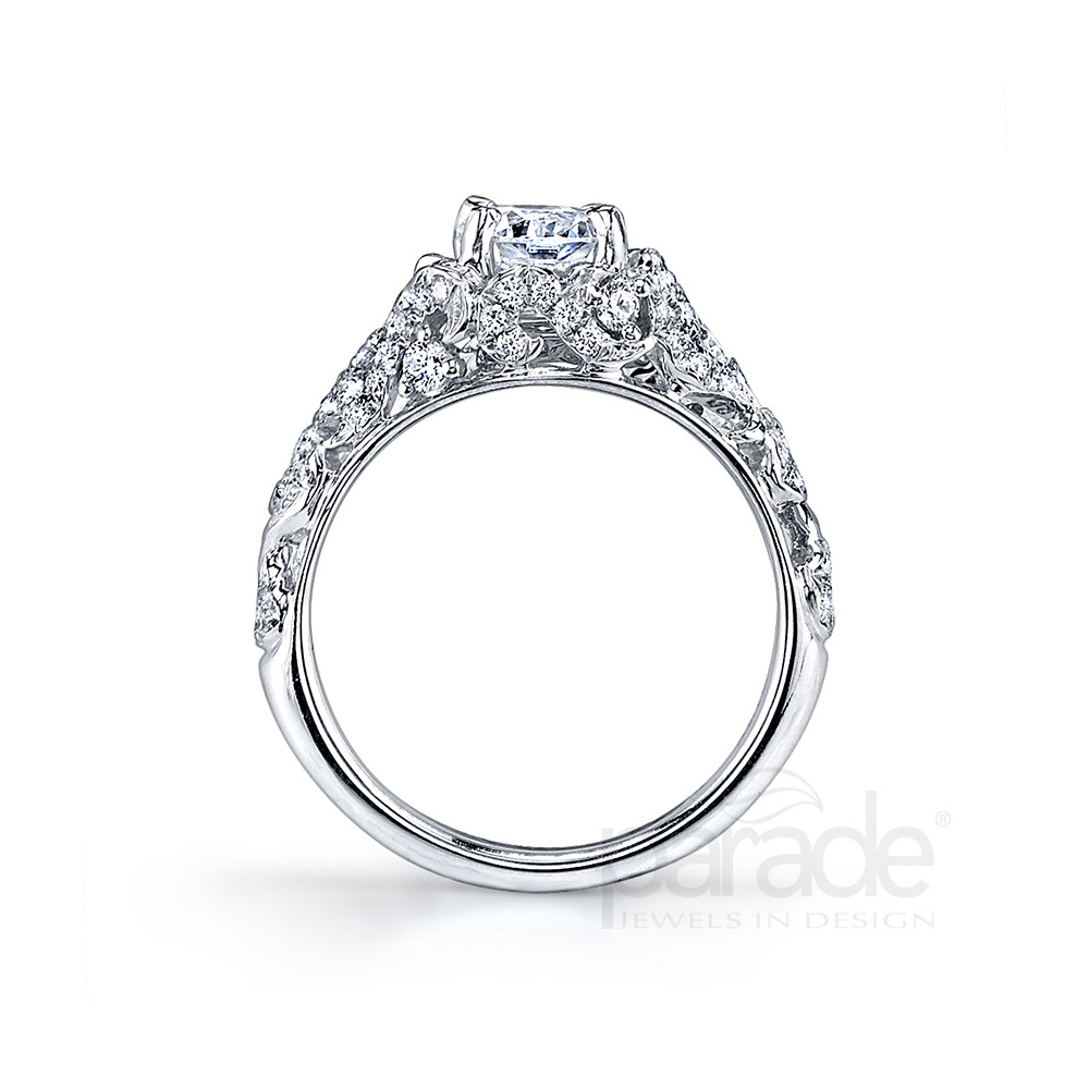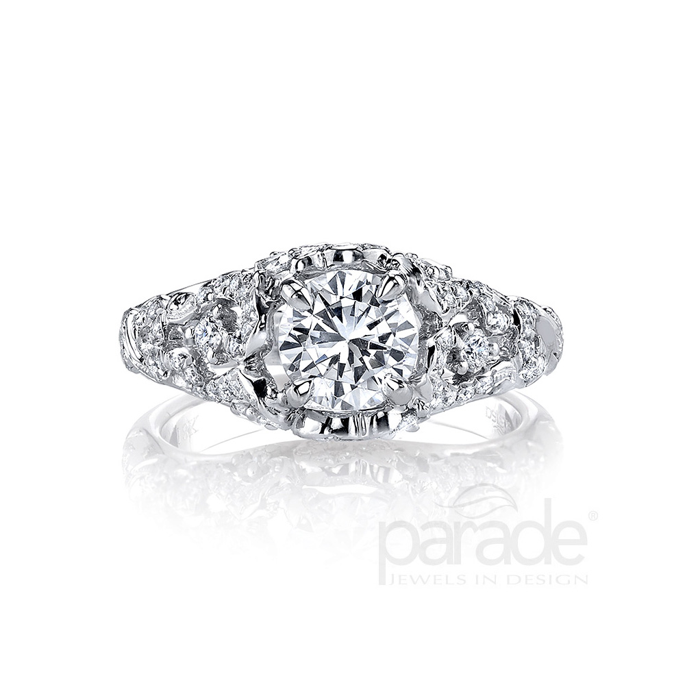 Brilliant diamonds float amid openwork scrolls of gold, showcasing a gleaming center stone. Available in Platinum, as well as 18K White, Yellow or Rose Gold.