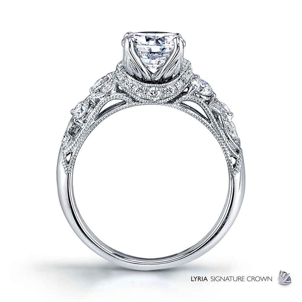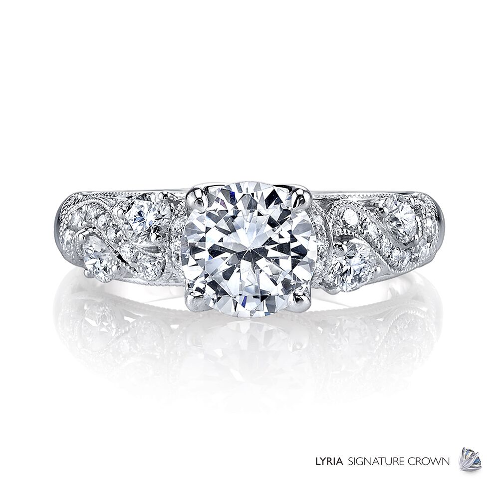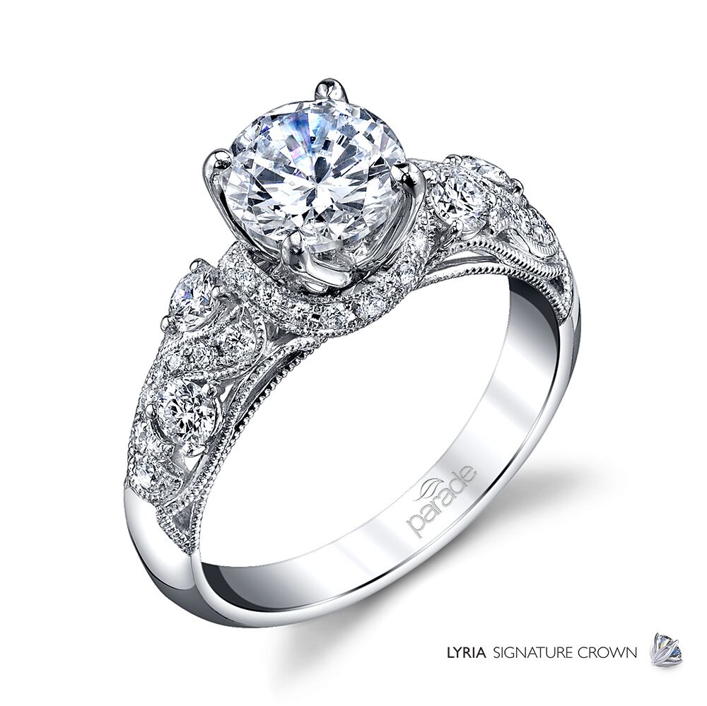 Milgrain etched art deco curves dance around bright diamonds, leading to a sparkling center stone in Parade’s signature Lyria crown. Available in Platinum, as well as 18K White, Yellow or Rose Gold.