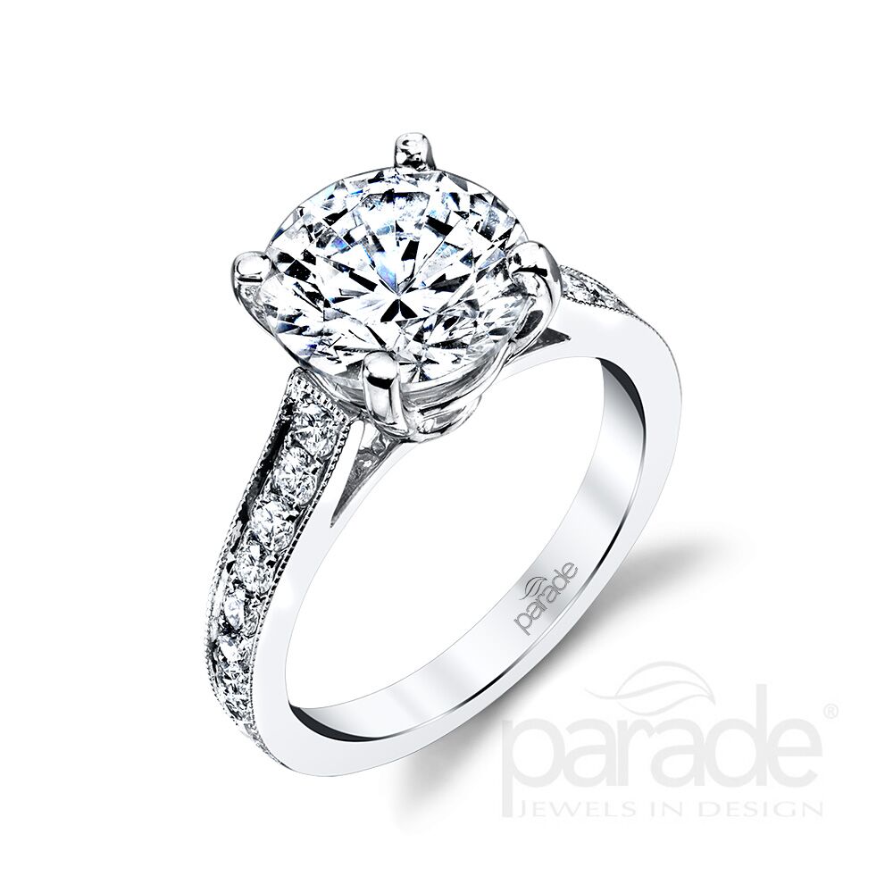 An elegant milgrain etched band of 0.42cts of diamonds graduates toward a sparkling center stone set in 18K gold. Available in Platinum, as well as 18K White, Yellow or Rose Gold.