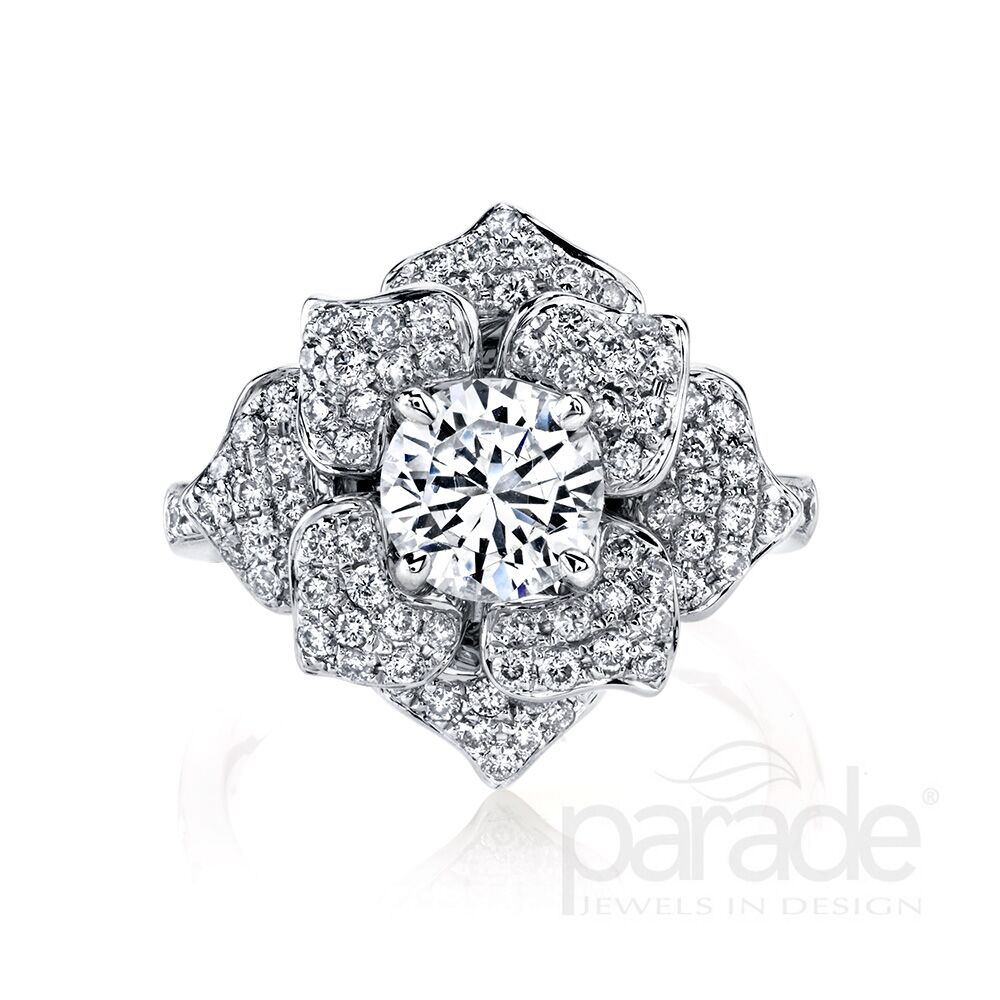 A delicate tapered diamond band leads to an extraordinary blossom of diamond set petals, showcasing a sparkling center stone in 18K gold. Available in Platinum, as well as 18K White, Yellow or Rose Gold.