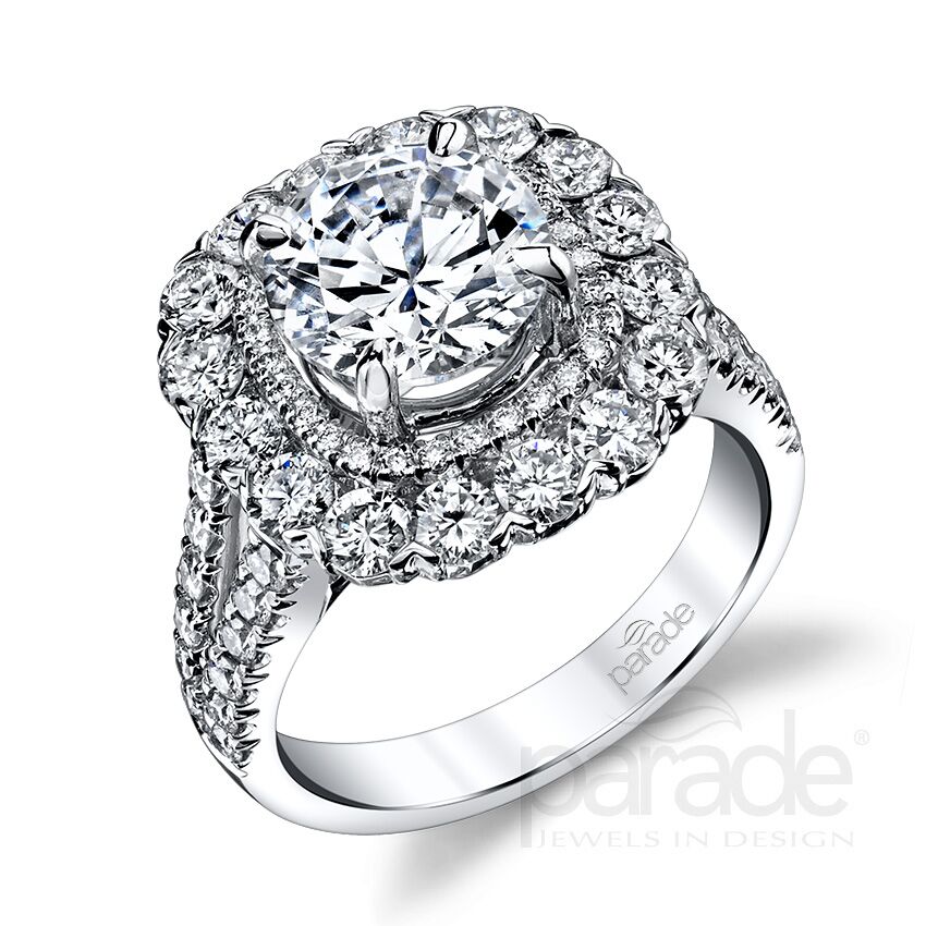 The classic halo is reinvented in this bold new style from the Hemera Collection. A diamond encrusted split band leads to a double cushion shaped halo circling a dazzling round diamond. Available in Platinum, as well as 18K White, Yellow or Rose Gold.